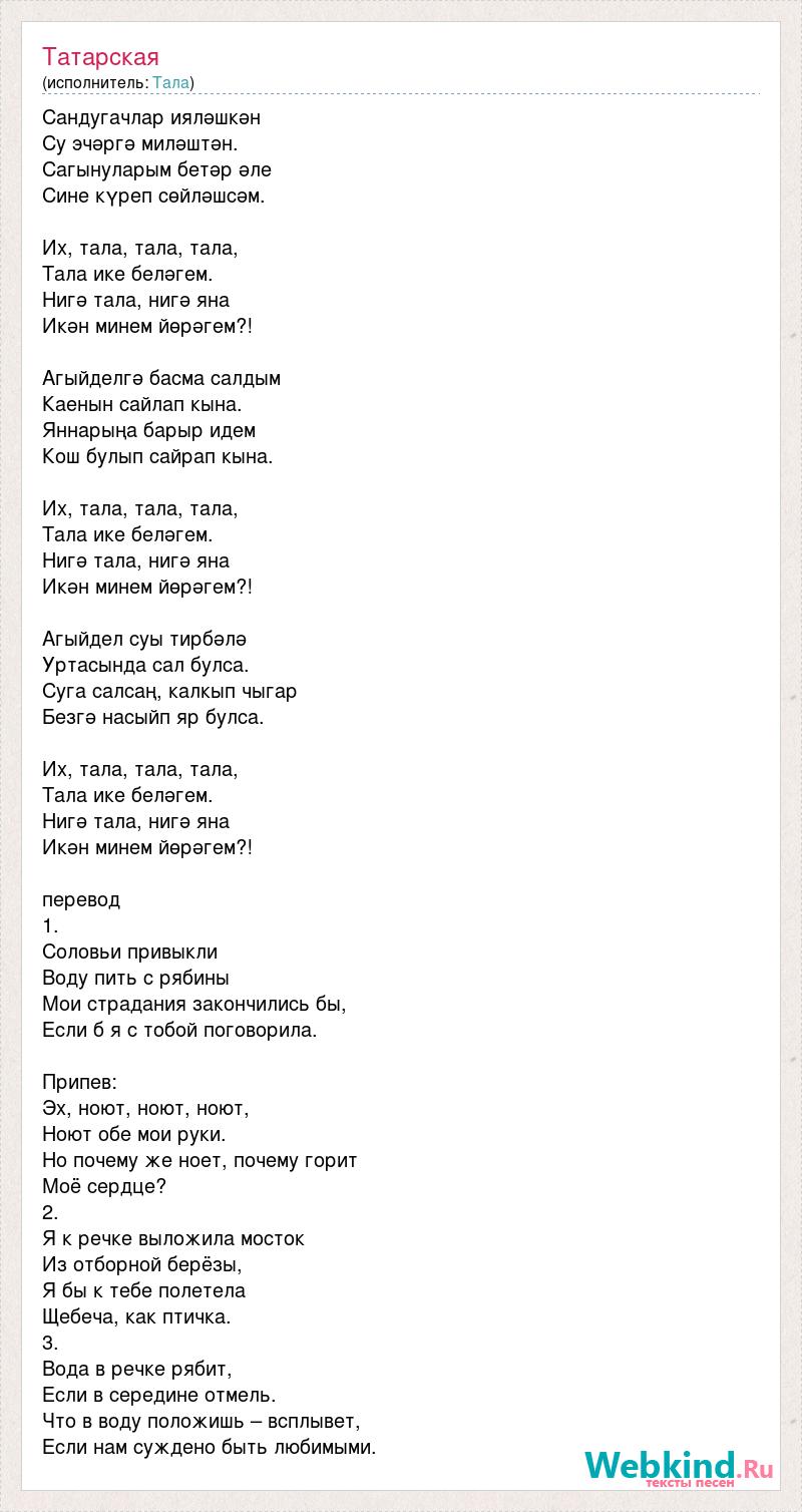 Сандугачлар ияләшкән Су эчәргә миләштән. Сагынуларым бетәр әле Сине күреп сөйләшсәм. Их, тала, тала, тала, Тала ике беләгем. Нигә тала, нигә яна Икән минем йөрәгем?! Агыйделгә басма салдым Каенын сайлап кына. Яннарыңа барыр идем Кош булып сайрап кына. Их, тала, тала, тала, Тала ике беләгем. Нигә тала, нигә яна Икән минем йөрәгем?! Агыйдел суы тирбәлә Уртасында сал булса. Суга салсаң, калкып чыгар Безгә насыйп яр булса. Их, тала, тала, тала, Тала ике беләгем. Нигә тала, нигә яна Икән минем йөрәгем?! перевод 1. Соловьи привыкли Воду пить с рябины Мои страдания закончились бы, Если б я с тобой поговорила. Припев: Эх, ноют, ноют, ноют, Ноют обе мои руки. Но почему же ноет, почему горит Моё сердце? 2. Я к речке выложила мосток Из отборной берёзы, Я бы к тебе полетела Щебеча, как птичка. 3. Вода в речке рябит, Если в середине отмель. Что в воду положишь – всплывет, Если нам суждено быть любимыми.