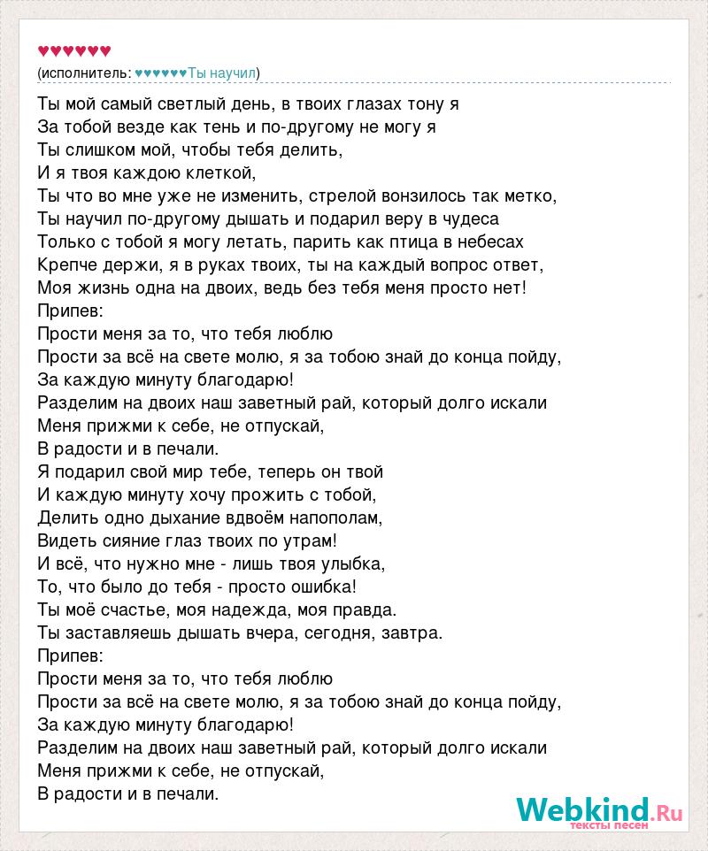 Ты мой самый светлый день, в твоих глазах тону я За тобой везде как тень и по-другому не могу я Ты слишком мой, чтобы тебя делить, И я твоя каждою клеткой, Ты что во мне уже не изменить, стрелой вонзилось так метко, Ты научил по-другому дышать и подарил веру в чудеса Только с тобой я могу летать, парить как птица в небесах Крепче держи, я в руках твоих, ты на каждый вопрос ответ, Моя жизнь одна на двоих, ведь без тебя меня просто нет! Припев: Прости меня за то, что тебя люблю Прости за всё на свете молю, я за тобою знай до конца пойду, За каждую минуту благодарю! Разделим на двоих наш заветный рай, который долго искали Меня прижми к себе, не отпускай, В радости и в печали. Я подарил свой мир тебе, теперь он твой И каждую минуту хочу прожить с тобой, Делить одно дыхание вдвоём напополам, Видеть сияние глаз твоих по утрам! И всё, что нужно мне - лишь твоя улыбка, То, что было до тебя - просто ошибка! Ты моё счастье, моя надежда, моя правда. Ты заставляешь дышать вчера, сегодня, завтра. Припев: Прости меня за то, что тебя люблю Прости за всё на свете молю, я за тобою знай до конца пойду, За каждую минуту благодарю! Разделим на двоих наш заветный рай, который долго искали Меня прижми к себе, не отпускай, В радости и в печали.