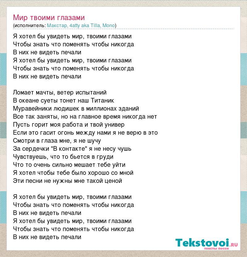 Я хотел бы увидеть мир, твоими глазами Чтобы знать что поменять чтобы никогда В них не видеть печали Я хотел бы увидеть мир, твоими глазами Чтобы знать что поменять чтобы никогда В них не видеть печали Ломает мачты, ветер испытаний В океане суеты тонет наш Титаник Муравейники людишек в миллионах зданий Все так заняты, но на главное время никогда нет Пусть горит моя работа и твой универ Если это гасит огонь между нами я не верю в это Смотри в глаза мне, я не шучу За сердечки "В контакте" я не несу чушь Чувствуешь, что то бьется в груди Что то очень сильно мешает тебе уйти Я хотел чтобы тебе было хорошо со мной Эти песни не нужны мне такой ценой Я хотел бы увидеть мир, твоими глазами Чтобы знать что поменять чтобы никогда В них не видеть печали Я хотел бы увидеть мир, твоими глазами Чтобы знать что поменять чтобы никогда В них не видеть печали
