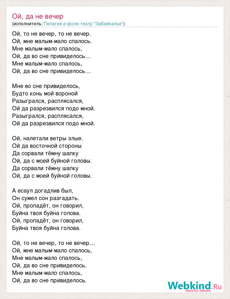 Ой, то не вечер, то не вечер. Ой, мне малым-мало спалось. Мне малым-мало спалось, Ой, да во сне привиделось… Мне малым-мало спалось, Ой, да во сне привиделось… Мне во сне привиделось, Будто конь мой вороной Разыгрался, расплясался, Ой да разрезвился подо мной. Разыгрался, расплясался, Ой да разрезвился подо мной. Ой, налетали ветры злые. Ой да восточной стороны Да сорвали тёмну шапку Ой, да с моей буйной головы. Да сорвали тёмну шапку Ой, да с моей буйной головы. А есаул догадлив был, Он сумел сон разгадать. Ой, пропадёт, он говорил, Буйна твоя буйна голова. Ой, пропадёт, он говорил, Буйна твоя буйна голова. Ой, то не вечер, то не вечер… Ой, мне малым-мало спалось, Мне малым-мало спалось, Ой, да во сне привиделось. Мне малым-мало спалось, Ой, да во сне привиделось.
