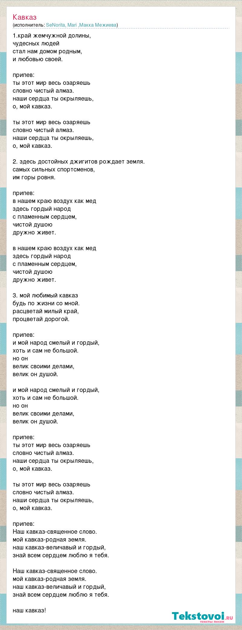 1.край жемчужной долины, чудесных людей стал нам домом родным, и любовью своей. припев: ты этот мир весь озаряешь словно чистый алмаз. наши сердца ты окрыляешь, о, мой кавказ. ты этот мир весь озаряешь словно чистый алмаз. наши сердца ты окрыляешь, о, мой кавказ. 2. здесь достойных джигитов рождает земля. самых сильных спортсменов, им горы ровня. припев: в нашем краю воздух как мед здесь гордый народ с пламенным сердцем, чистой душою дружно живет. в нашем краю воздух как мед здесь гордый народ с пламенным сердцем, чистой душою дружно живет. 3. мой любимый кавказ будь по жизни со мной. расцветай милый край, процветай дорогой. припев: и мой народ смелый и гордый, хоть и сам не большой. но он велик своими делами, велик он душой. и мой народ смелый и гордый, хоть и сам не большой. но он велик своими делами, велик он душой. припев: ты этот мир весь озаряешь словно чистый алмаз. наши сердца ты окрыляешь, о, мой кавказ. ты этот мир весь озаряешь словно чистый алмаз. наши сердца ты окрыляешь, о, мой кавказ. припев: Наш кавказ-священное слово. мой кавказ-родная земля. наш кавказ-величавый и гордый, знай всем сердцем люблю я тебя. Наш кавказ-священное слово. мой кавказ-родная земля. наш кавказ-величавый и гордый, знай всем сердцем люблю я тебя. наш кавказ!