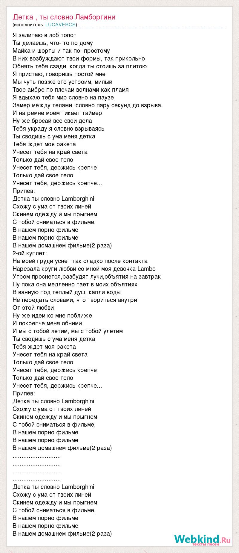 Я залипаю в лоб топот Ты делаешь, что- то по дому Майка и шорты и так по- простому В них возбуждают твои формы, так прикольно Обнять тебя сзади, когда ты стоишь за плитою Я пристаю, говоришь постой мне Мы чуть позже это устроим, милый Твое амбре по плечам волнами как пламя Я вдыхаю тебя мир словно на паузе Замер между телами, словно пару секунд до взрыва И на ремне моем тикает таймер Ну же бросай все свои дела Тебя украду я словно взрываясь Ты сводишь с ума меня детка Тебя ждет моя ракета Унесет тебя на край света Только дай свое тело Унесет тебя, держись крепче Только дай свое тело Унесет тебя, держись крепче... Припев: Детка ты словно Lamborghini Схожу с ума от твоих линей Скинем одежду и мы прыгнем С тобой сниматься в фильме, В нашем порно фильме В нашем порно фильме В нашем домашнем фильме(2 раза) 2-ой куплет: На моей груди уснет так сладко после контакта Нарезала круги любви со мной моя девочка Lambo Утром проснется,разбудят лучи,объятия на завтрак Ну пока она медленно тает в моих объятиях В ванную под теплый душ, капли воды Не передать словами, что твориться внутри От этой любви Ну же идем ко мне поближе И покрепче меня обними И мы с тобой летим, мы с тобой улетим Ты сводишь с ума меня детка Тебя ждет моя ракета Унесет тебя на край света Только дай свое тело Унесет тебя, держись крепче Только дай свое тело Унесет тебя, держись крепче... Припев: Детка ты словно Lamborghini Схожу с ума от твоих линей Скинем одежду и мы прыгнем С тобой сниматься в фильме, В нашем порно фильме В нашем порно фильме В нашем домашнем фильме(2 раза) ........................... ........................... ........................... ........................... Детка ты словно Lamborghini Схожу с ума от твоих линей Скинем одежду и мы прыгнем С тобой сниматься в фильме, В нашем порно фильме В нашем порно фильме В нашем домашнем фильме(2 раза)