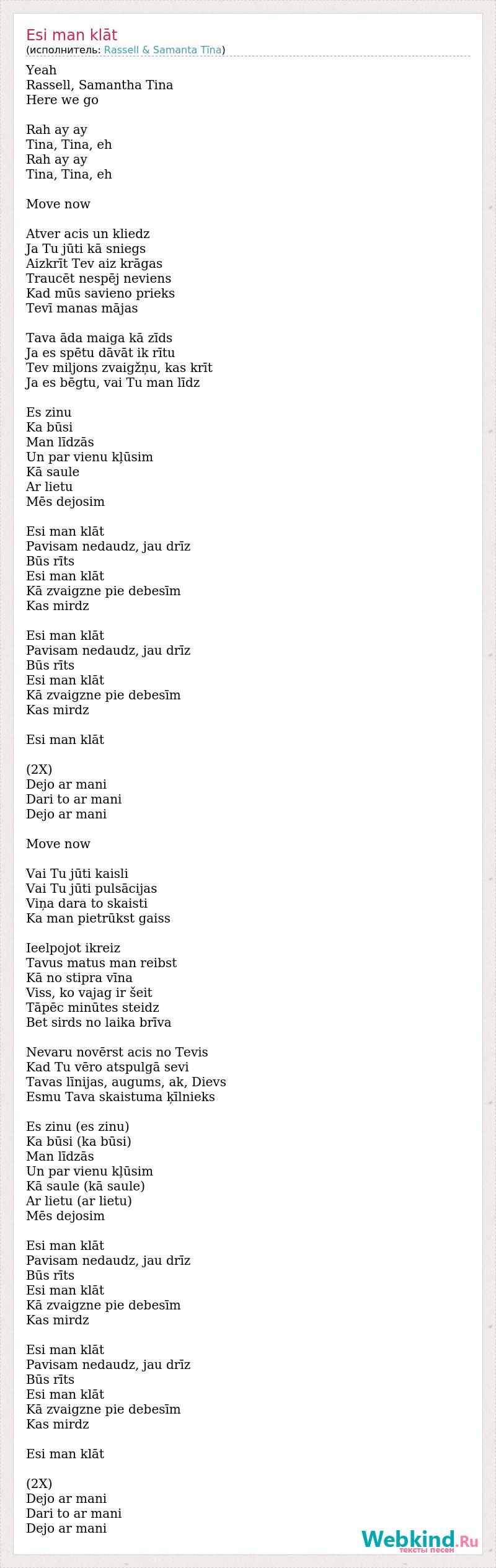 Yeah Rassell, Samantha Tina Here we go Rah ay ay Tina, Tina, eh Rah ay ay Tina, Tina, eh Move now Atver acis un kliedz Ja Tu jūti kā sniegs Aizkrīt Tev aiz krāgas Traucēt nespēj neviens Kad mūs savieno prieks Tevī manas mājas Tava āda maiga kā zīds Ja es spētu dāvāt ik rītu Tev miljons zvaigžņu, kas krīt Ja es bēgtu, vai Tu man līdz Es zinu Ka būsi Man līdzās Un par vienu kļūsim Kā saule Ar lietu Mēs dejosim Esi man klāt Pavisam nedaudz, jau drīz Būs rīts Esi man klāt Kā zvaigzne pie debesīm Kas mirdz Esi man klāt Pavisam nedaudz, jau drīz Būs rīts Esi man klāt Kā zvaigzne pie debesīm Kas mirdz Esi man klāt (2X) Dejo ar mani Dari to ar mani Dejo ar mani Move now Vai Tu jūti kaisli Vai Tu jūti pulsācijas Viņa dara to skaisti Ka man pietrūkst gaiss Ieelpojot ikreiz Tavus matus man reibst Kā no stipra vīna Viss, ko vajag ir šeit Tāpēc minūtes steidz Bet sirds no laika brīva Nevaru novērst acis no Tevis Kad Tu vēro atspulgā sevi Tavas līnijas, augums, ak, Dievs Esmu Tava skaistuma ķīlnieks Es zinu (es zinu) Ka būsi (ka būsi) Man līdzās Un par vienu kļūsim Kā saule (kā saule) Ar lietu (ar lietu) Mēs dejosim Esi man klāt Pavisam nedaudz, jau drīz Būs rīts Esi man klāt Kā zvaigzne pie debesīm Kas mirdz Esi man klāt Pavisam nedaudz, jau drīz Būs rīts Esi man klāt Kā zvaigzne pie debesīm Kas mirdz Esi man klāt (2X) Dejo ar mani Dari to ar mani Dejo ar mani