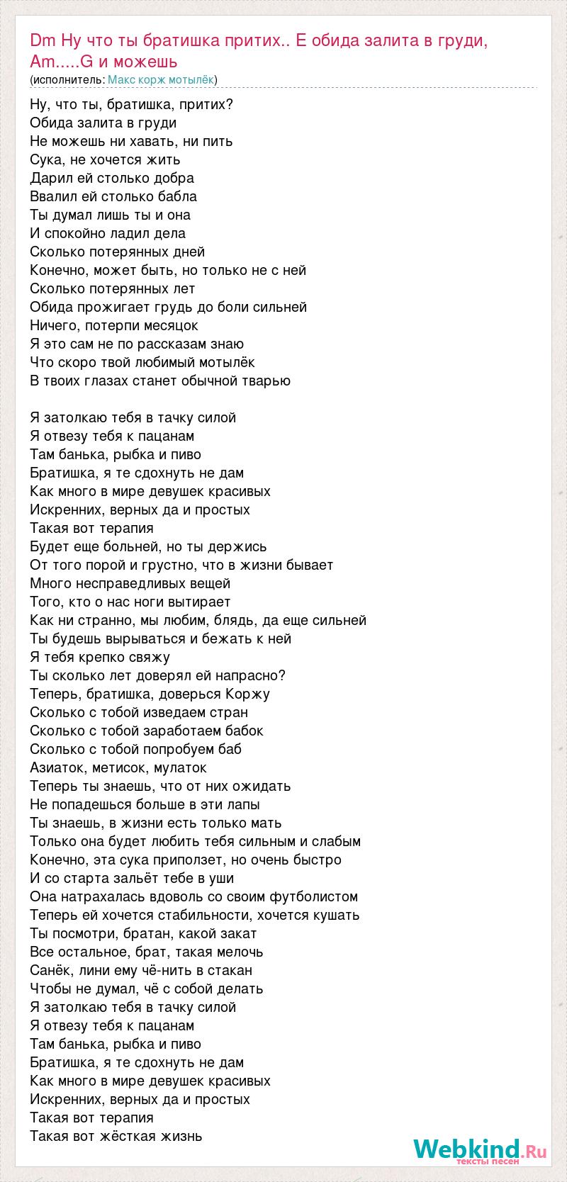 Ну, что ты, братишка, притих? Обида залита в груди Не можешь ни хавать, ни пить Сука, не хочется жить Дарил ей столько добра Ввалил ей столько бабла Ты думал лишь ты и она И спокойно ладил дела Сколько потерянных дней Конечно, может быть, но только не с ней Сколько потерянных лет Обида прожигает грудь до боли сильней Ничего, потерпи месяцок Я это сам не по рассказам знаю Что скоро твой любимый мотылёк В твоих глазах станет обычной тварью Я затолкаю тебя в тачку силой Я отвезу тебя к пацанам Там банька, рыбка и пиво Братишка, я те сдохнуть не дам Как много в мире девушек красивых Искренних, верных да и простых Такая вот терапия Будет еще больней, но ты держись От того порой и грустно, что в жизни бывает Много несправедливых вещей Того, кто о нас ноги вытирает Как ни странно, мы любим, блядь, да еще сильней Ты будешь вырываться и бежать к ней Я тебя крепко свяжу Ты сколько лет доверял ей напрасно? Теперь, братишка, доверься Коржу Сколько с тобой изведаем стран Сколько с тобой заработаем бабок Сколько с тобой попробуем баб Азиаток, метисок, мулаток Теперь ты знаешь, что от них ожидать Не попадешься больше в эти лапы Ты знаешь, в жизни есть только мать Только она будет любить тебя сильным и слабым Конечно, эта сука приползет, но очень быстро И со старта зальёт тебе в уши Она натрахалась вдоволь со своим футболистом Теперь ей хочется стабильности, хочется кушать Ты посмотри, братан, какой закат Все остальное, брат, такая мелочь Санёк, лини ему чё-нить в стакан Чтобы не думал, чё с собой делать Я затолкаю тебя в тачку силой Я отвезу тебя к пацанам Там банька, рыбка и пиво Братишка, я те сдохнуть не дам Как много в мире девушек красивых Искренних, верных да и простых Такая вот терапия Такая вот жёсткая жизнь