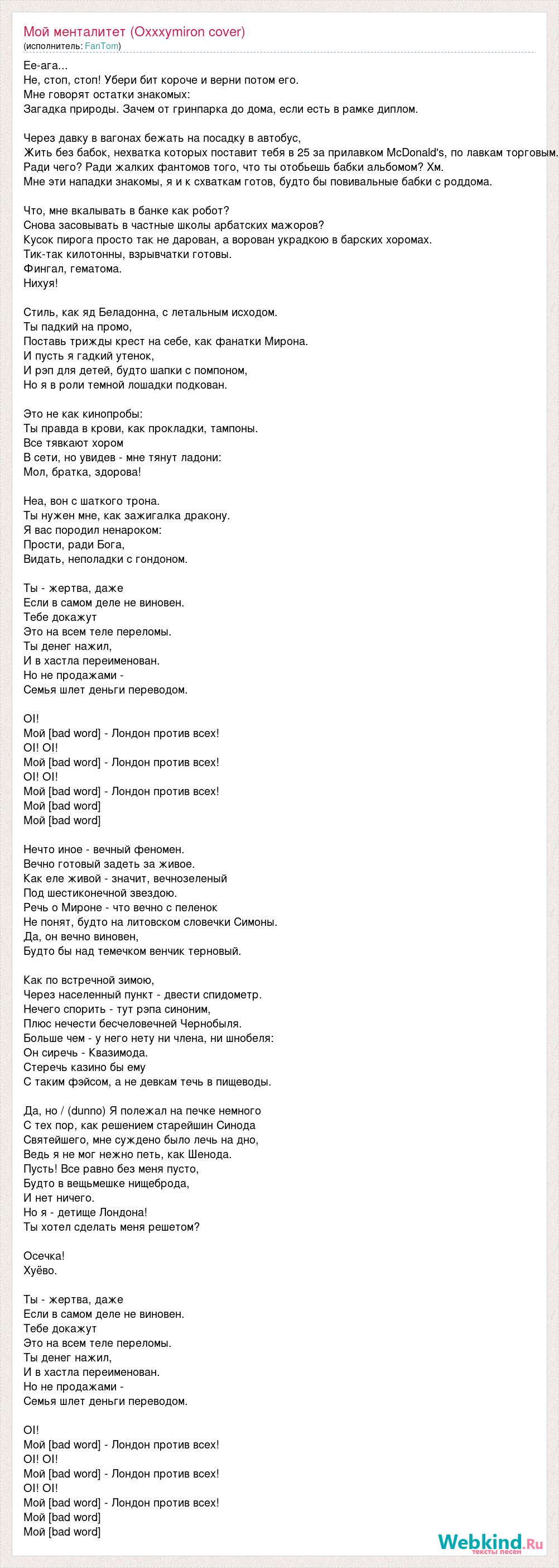 Ее-ага... Не, стоп, стоп! Убери бит короче и верни потом его. Мне говорят остатки знакомых: Загадка природы. Зачем от гринпарка до дома, если есть в рамке диплом. Через давку в вагонах бежать на посадку в автобус, Жить без бабок, нехватка которых поставит тебя в 25 за прилавком McDonald's, по лавкам торговым. Ради чего? Ради жалких фантомов того, что ты отобьешь бабки альбомом? Хм. Мне эти нападки знакомы, я и к схваткам готов, будто бы повивальные бабки с роддома. Что, мне вкалывать в банке как робот? Снова засовывать в частные школы арбатских мажоров? Кусок пирога просто так не дарован, а ворован украдкою в барских хоромах. Тик-так килотонны, взрывчатки готовы. Фингал, гематома. Нихуя! Стиль, как яд Беладонна, с летальным исходом. Ты падкий на промо, Поставь трижды крест на себе, как фанатки Мирона. И пусть я гадкий утенок, И рэп для детей, будто шапки с помпоном, Но я в роли темной лошадки подкован. Это не как кинопробы: Ты правда в крови, как прокладки, тампоны. Все тявкают хором В сети, но увидев - мне тянут ладони: Мол, братка, здорова! Неа, вон с шаткого трона. Ты нужен мне, как зажигалка дракону. Я вас породил ненароком: Прости, ради Бога, Видать, неполадки с гондоном. Ты - жертва, даже Если в самом деле не виновен. Тебе докажут Это на всем теле переломы. Ты денег нажил, И в хастла переименован. Но не продажами - Семья шлет деньги переводом. OI! Мой [bad word] - Лондон против всех! OI! OI! Мой [bad word] - Лондон против всех! OI! OI! Мой [bad word] - Лондон против всех! Мой [bad word] Мой [bad word] Нечто иное - вечный феномен. Вечно готовый задеть за живое. Как еле живой - значит, вечнозеленый Под шестиконечной звездою. Речь о Мироне - что вечно с пеленок Не понят, будто на литовском словечки Симоны. Да, он вечно виновен, Будто бы над темечком венчик терновый. Как по встречной зимою, Через населенный пункт - двести спидометр. Нечего спорить - тут рэпа синоним, Плюс нечести бесчеловечней Чернобыля. Больше чем - у него нету ни члена, ни шнобеля: Он сиречь - Квазимода. Стеречь казино бы ему С таким фэйсом, а не девкам течь в пищеводы. Да, но / (dunno) Я полежал на печке немного С тех пор, как решением старейшин Синода Святейшего, мне суждено было лечь на дно, Ведь я не мог нежно петь, как Шенода. Пусть! Все равно без меня пусто, Будто в вещьмешке нищеброда, И нет ничего. Но я - детище Лондона! Ты хотел сделать меня решетом? Осечка! Хуёво. Ты - жертва, даже Если в самом деле не виновен. Тебе докажут Это на всем теле переломы. Ты денег нажил, И в хастла переименован. Но не продажами - Семья шлет деньги переводом. OI! Мой [bad word] - Лондон против всех! OI! OI! Мой [bad word] - Лондон против всех! OI! OI! Мой [bad word] - Лондон против всех! Мой [bad word] Мой [bad word]