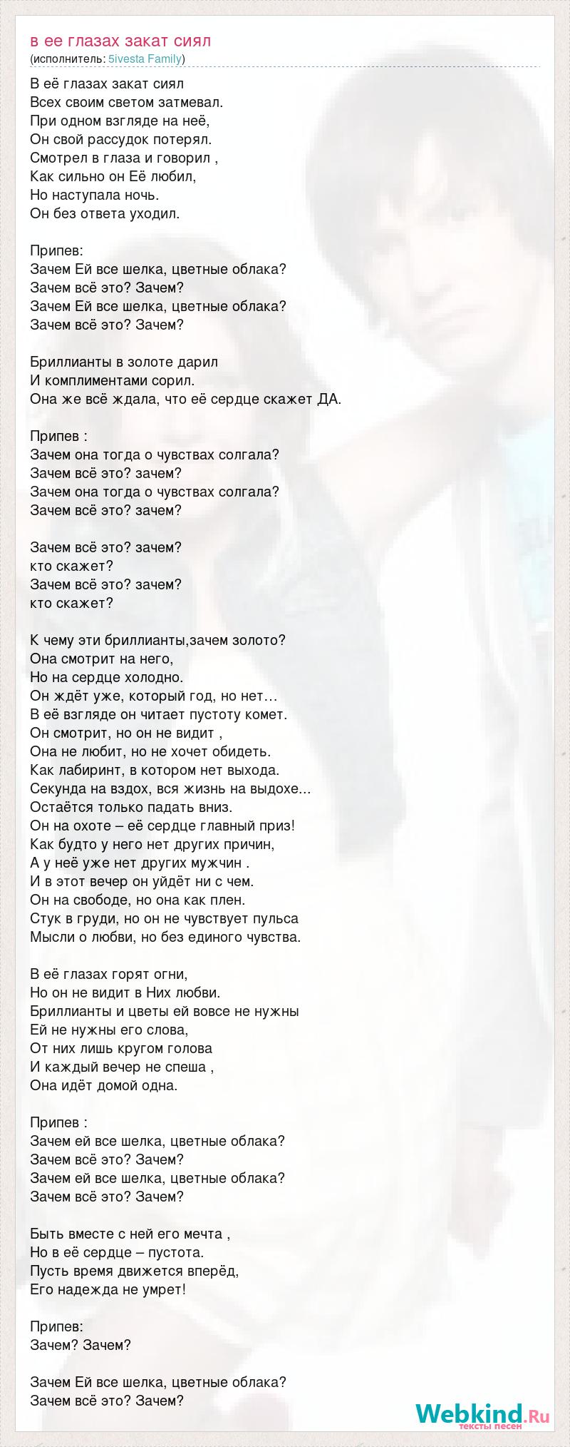В её глазах закат сиял Всех своим светом затмевал. При одном взгляде на неё, Он свой рассудок потерял. Смотрел в глаза и говорил , Как сильно он Её любил, Но наступала ночь. Он без ответа уходил. Припев: Зачем Ей все шелка, цветные облака? Зачем всё это? Зачем? Зачем Ей все шелка, цветные облака? Зачем всё это? Зачем? Бриллианты в золоте дарил И комплиментами сорил. Она же всё ждала, что её сердце скажет ДА. Припев : Зачем она тогда о чувствах солгала? Зачем всё это? зачем? Зачем она тогда о чувствах солгала? Зачем всё это? зачем? Зачем всё это? зачем? кто скажет? Зачем всё это? зачем? кто скажет? К чему эти бриллианты,зачем золото? Она смотрит на него, Но на сердце холодно. Он ждёт уже, который год, но нет… В её взгляде он читает пустоту комет. Он смотрит, но он не видит , Она не любит, но не хочет обидеть. Как лабиринт, в котором нет выхода. Секунда на вздох, вся жизнь на выдохе... Остаётся только падать вниз. Он на охоте – её сердце главный приз! Как будто у него нет других причин, А у неё уже нет других мужчин . И в этот вечер он уйдёт ни с чем. Он на свободе, но она как плен. Стук в груди, но он не чувствует пульса Мысли о любви, но без единого чувства. В её глазах горят огни, Но он не видит в Них любви. Бриллианты и цветы ей вовсе не нужны Ей не нужны его слова, От них лишь кругом голова И каждый вечер не спеша , Она идёт домой одна. Припев : Зачем ей все шелка, цветные облака? Зачем всё это? Зачем? Зачем ей все шелка, цветные облака? Зачем всё это? Зачем? Быть вместе с ней его мечта , Но в её сердце – пустота. Пусть время движется вперёд, Его надежда не умрет! Припев: Зачем? Зачем? Зачем Ей все шелка, цветные облака? Зачем всё это? Зачем?
