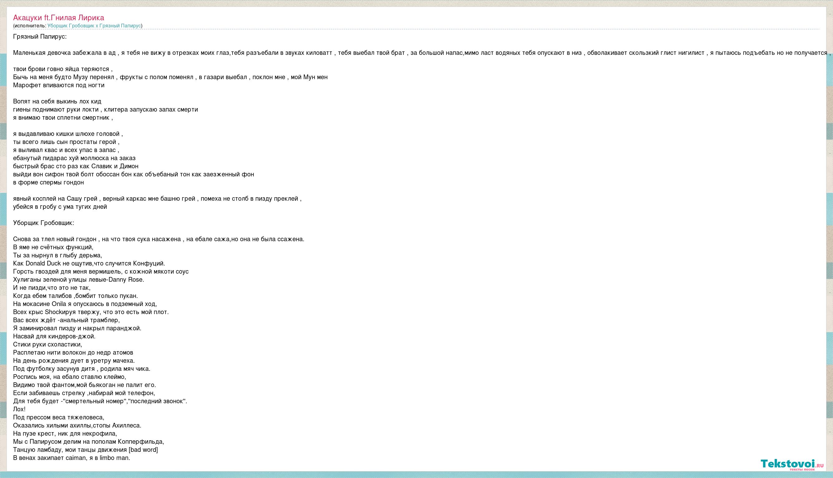 Грязный Папирус: Маленькая девочка забежала в ад , я тебя не вижу в отрезках моих глаз,тебя разъебали в звуках киловатт , тебя выебал твой брат , за большой напас,мимо ласт водяных тебя опускают в низ , обволакивает скользкий глист нигилист , я пытаюсь подъебать но не получается , твои брови говно яйца теряются , Бычь на меня будто Музу перенял , фрукты с полом поменял , в газари выебал , поклон мне , мой Мун мен Марофет впиваются под ногти Вопят на себя выкинь лох кид гиены поднимают руки локти , клитера запускаю запах смерти я внимаю твои сплетни смертник , я выдавливаю кишки шлюхе головой , ты всего лишь сын простаты герой , я выливал квас и всех упас в запас , ебанутый пидарас хуй моллюска на заказ быстрый брас сто раз как Славик и Димон выйди вон сифон твой болт обоссан бон как объебаный тон как заезженный фон в форме спермы гондон явный косплей на Сашу грей , верный каркас мне башню грей , помеха не столб в пизду преклей , убейся в гробу с ума тугих дней Уборщик Гробовщик: Снова за тлел новый гондон , на что твоя сука насажена , на ебале сажа,но она не была ссажена. В яме не счётных функций, Ты за нырнул в глыбу дерьма, Как Donald Duck не ощутив,что случится Конфуций. Горсть гвоздей для меня вермишель, с кожной мякоти соус Хулиганы зеленой улицы левые-Danny Rose. И не пизди,что это не так, Когда ебем талибов ,бомбит только пукан. На мокасине Onila я опускаюсь в подземный ход, Всех крыс Shockируя твержу, что это есть мой плот. Вас всех ждёт -анальный трамблер, Я заминировал пизду и накрыл паранджой. Насвай для киндеров-джой. Стики руки схоластики, Расплетаю нити волокон до недр атомов На день рождения дует в уретру мачеха. Под футболку засунув дитя , родила мяч чика. Роспись моя, на ебало ставлю клеймо, Видимо твой фантом,мой бьякоган не палит его. Если забиваешь стрелку ,набирай мой телефон, Для тебя будет -''смертельный номер'',''последний звонок''. Лох! Под прессом веса тяжеловеса, Оказались хилыми ахиллы,стопы Ахиллеса. На пузе крест, ник для некрофила, Мы с Папирусом делим на пополам Копперфильда, Танцую ламбаду, мои танцы движения [bad word] В венах закипает caiman, я в limbo man.