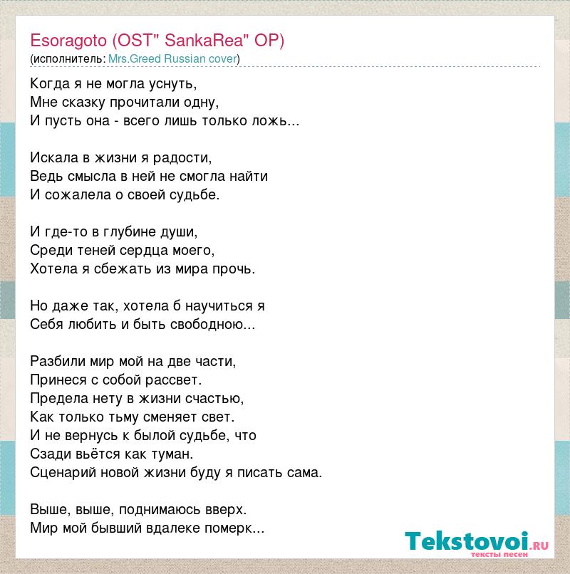 Когда я не могла уснуть, Мне сказку прочитали одну, И пусть она - всего лишь только ложь... Искала в жизни я радости, Ведь смысла в ней не смогла найти И сожалела о своей судьбе. И где-то в глубине души, Среди теней сердца моего, Хотела я сбежать из мира прочь. Но даже так, хотела б научиться я Себя любить и быть свободною... Разбили мир мой на две части, Принеся с собой рассвет. Предела нету в жизни счастью, Как только тьму сменяет свет. И не вернусь к былой судьбе, что Сзади вьётся как туман. Сценарий новой жизни буду я писать сама. Выше, выше, поднимаюсь вверх. Мир мой бывший вдалеке померк...