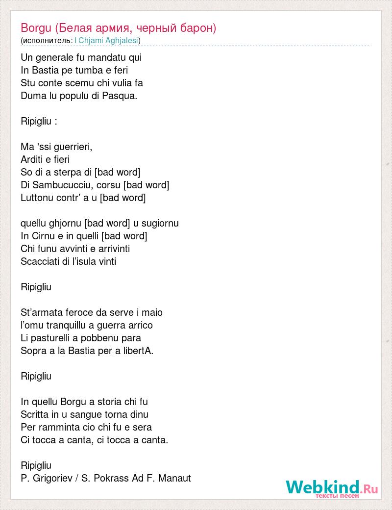 Un generale fu mandatu qui In Bastia pe tumba e feri Stu conte scemu chi vulia fa Duma lu populu di Pasqua. Ripigliu : Ma 'ssi guerrieri, Arditi e fieri So di a sterpa di [bad word] Di Sambucucciu, corsu [bad word] Luttonu contr’ a u [bad word] quellu ghjornu [bad word] u sugiornu In Cirnu e in quelli [bad word] Chi funu avvinti e arrivinti Scacciati di l’isula vinti Ripigliu St’armata feroce da serve i maio l’omu tranquillu a guerra arrico Li pasturelli a pobbenu para Sopra a la Bastia per a libertA. Ripigliu In quellu Borgu a storia chi fu Scritta in u sangue torna dinu Per ramminta cio chi fu e sera Ci tocca a canta, ci tocca a canta. Ripigliu P. Grigoriev / S. Pokrass Ad F. Manaut