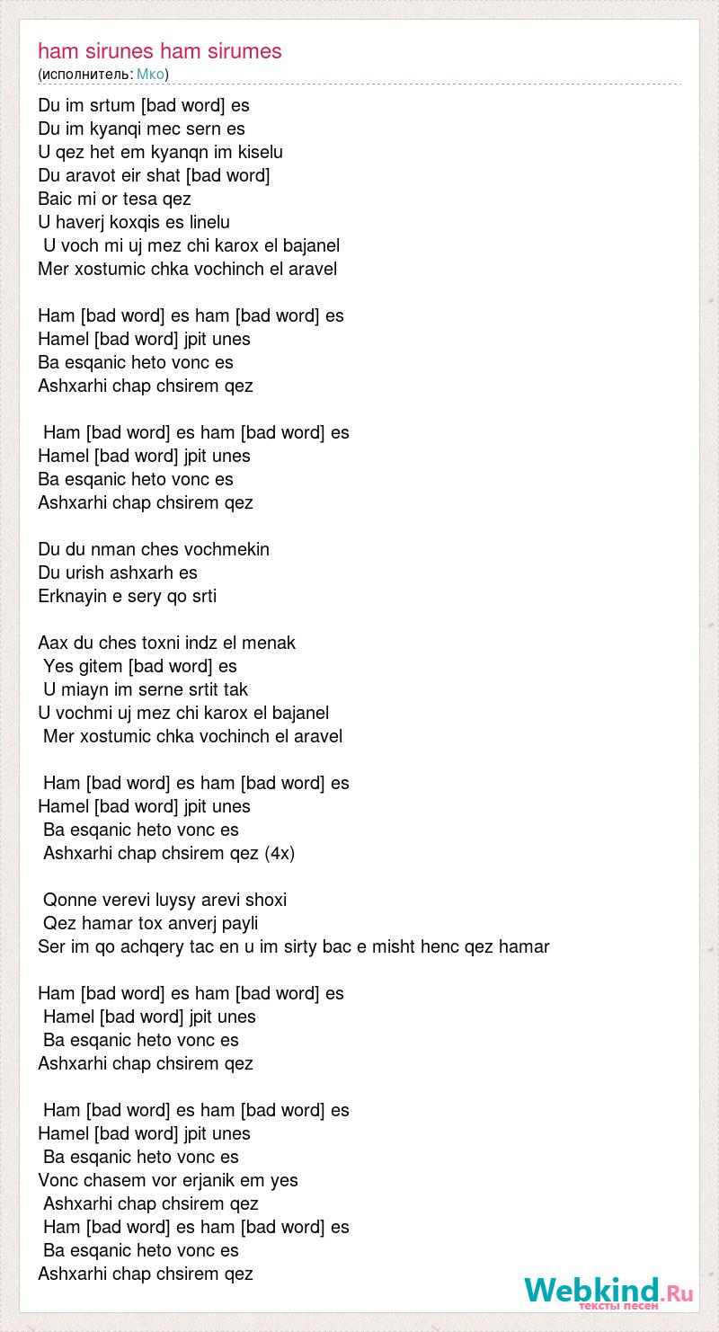 Du im srtum [bad word] es Du im kyanqi mec sern es U qez het em kyanqn im kiselu Du aravot eir shat [bad word] Baic mi or tesa qez U haverj koxqis es linelu U voch mi uj mez chi karox el bajanel Mer xostumic chka vochinch el aravel Ham [bad word] es ham [bad word] es Hamel [bad word] jpit unes Ba esqanic heto vonc es Ashxarhi chap chsirem qez Ham [bad word] es ham [bad word] es Hamel [bad word] jpit unes Ba esqanic heto vonc es Ashxarhi chap chsirem qez Du du nman ches vochmekin Du urish ashxarh es Erknayin e sery qo srti Aax du ches toxni indz el menak Yes gitem [bad word] es U miayn im serne srtit tak U vochmi uj mez chi karox el bajanel Mer xostumic chka vochinch el aravel Ham [bad word] es ham [bad word] es Hamel [bad word] jpit unes Ba esqanic heto vonc es Ashxarhi chap chsirem qez (4х) Qonne verevi luysy arevi shoxi Qez hamar tox anverj payli Ser im qo achqery tac en u im sirty bac e misht henc qez hamar Ham [bad word] es ham [bad word] es Hamel [bad word] jpit unes Ba esqanic heto vonc es Ashxarhi chap chsirem qez Ham [bad word] es ham [bad word] es Hamel [bad word] jpit unes Ba esqanic heto vonc es Vonc chasem vor erjanik em yes Ashxarhi chap chsirem qez Ham [bad word] es ham [bad word] es Ba esqanic heto vonc es Ashxarhi chap chsirem qez