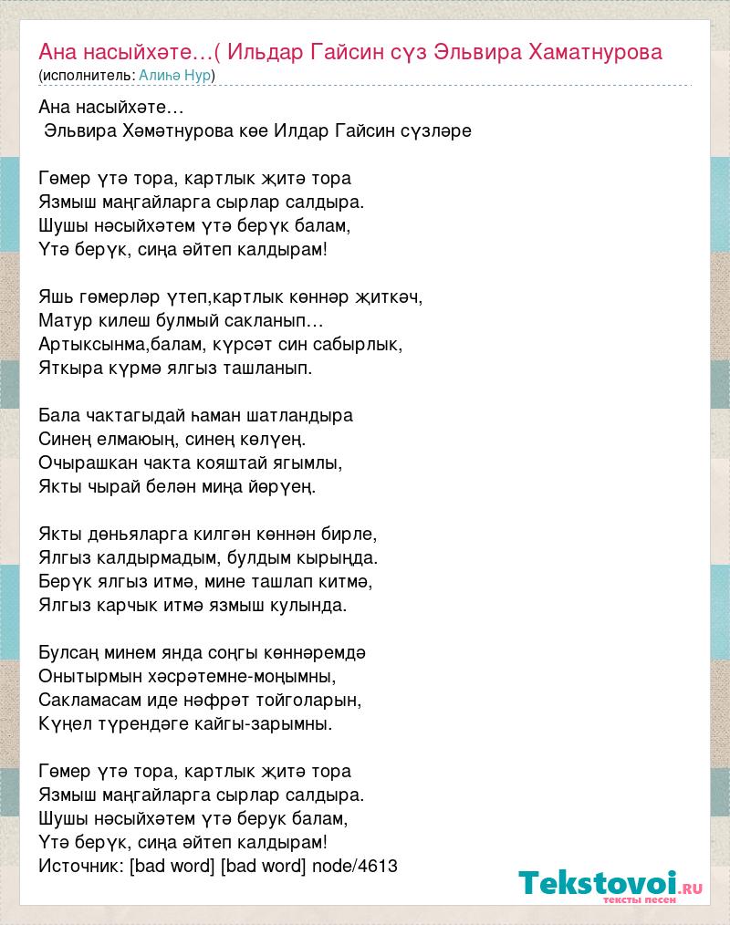 Ана насыйхәте… Эльвира Хәмәтнурова көе Илдар Гайсин сүзләре Гөмер үтә тора, картлык җитә тора Язмыш маңгайларга сырлар салдыра. Шушы нәсыйхәтем үтә берүк балам, Үтә берүк, сиңа әйтеп калдырам! Яшь гөмерләр үтеп,картлык көннәр җиткәч, Матур килеш булмый сакланып… Артыксынма,балам, күрсәт син сабырлык, Яткыра күрмә ялгыз ташланып. Бала чактагыдай һаман шатландыра Синең елмаюың, синең көлүең. Очырашкан чакта кояштай ягымлы, Якты чырай белән миңа йөрүең. Якты дөньяларга килгән көннән бирле, Ялгыз калдырмадым, булдым кырыңда. Берүк ялгыз итмә, мине ташлап китмә, Ялгыз карчык итмә язмыш кулында. Булсаң минем янда соңгы көннәремдә Онытырмын хәсрәтемне-моңымны, Сакламасам иде нәфрәт тойголарын, Күңел түрендәге кайгы-зарымны. Гөмер үтә тора, картлык җитә тора Язмыш маңгайларга сырлар салдыра. Шушы нәсыйхәтем үтә берук балам, Үтә берүк, сиңа әйтеп калдырам! Источник: [bad word] [bad word] node/4613