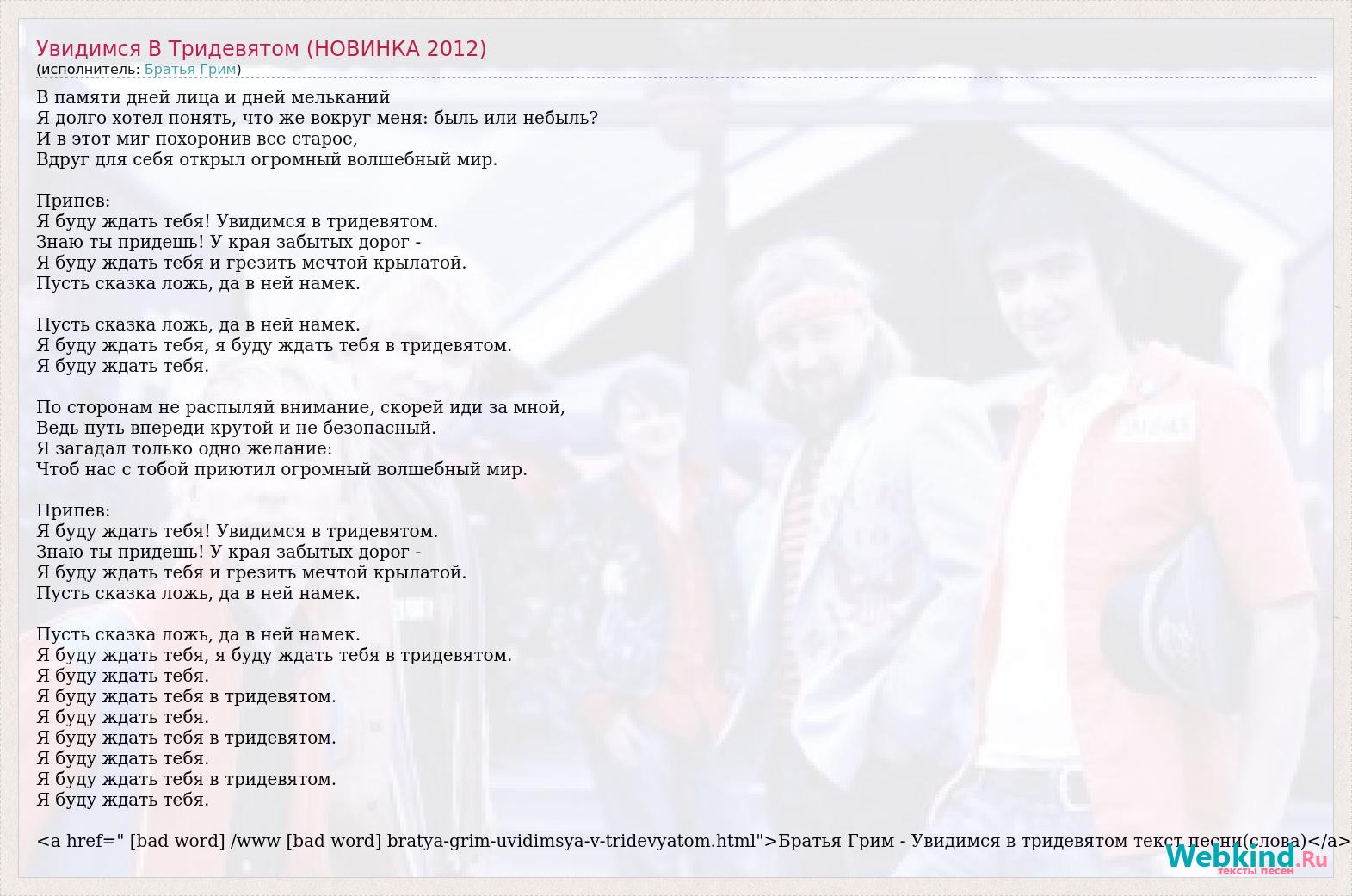 В памяти дней лица и дней мельканий Я долго хотел понять, что же вокруг меня: быль или небыль? И в этот миг похоронив все старое, Вдруг для себя открыл огромный волшебный мир. Припев: Я буду ждать тебя! Увидимся в тридевятом. Знаю ты придешь! У края забытых дорог - Я буду ждать тебя и грезить мечтой крылатой. Пусть сказка ложь, да в ней намек. Пусть сказка ложь, да в ней намек. Я буду ждать тебя, я буду ждать тебя в тридевятом. Я буду ждать тебя. По сторонам не распыляй внимание, скорей иди за мной, Ведь путь впереди крутой и не безопасный. Я загадал только одно желание: Чтоб нас с тобой приютил огромный волшебный мир. Припев: Я буду ждать тебя! Увидимся в тридевятом. Знаю ты придешь! У края забытых дорог - Я буду ждать тебя и грезить мечтой крылатой. Пусть сказка ложь, да в ней намек. Пусть сказка ложь, да в ней намек. Я буду ждать тебя, я буду ждать тебя в тридевятом. Я буду ждать тебя. Я буду ждать тебя в тридевятом. Я буду ждать тебя. Я буду ждать тебя в тридевятом. Я буду ждать тебя. Я буду ждать тебя в тридевятом. Я буду ждать тебя. <a href=" [bad word] /www [bad word] bratya-grim-uvidimsya-v-tridevyatom.html">Братья Грим - Увидимся в тридевятом текст песни(слова)</a>