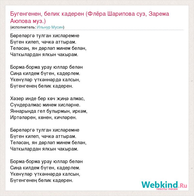 Бугенгенен, белик кадерен (Флёра Шарипова суз, Зарема Аюпова муз.)