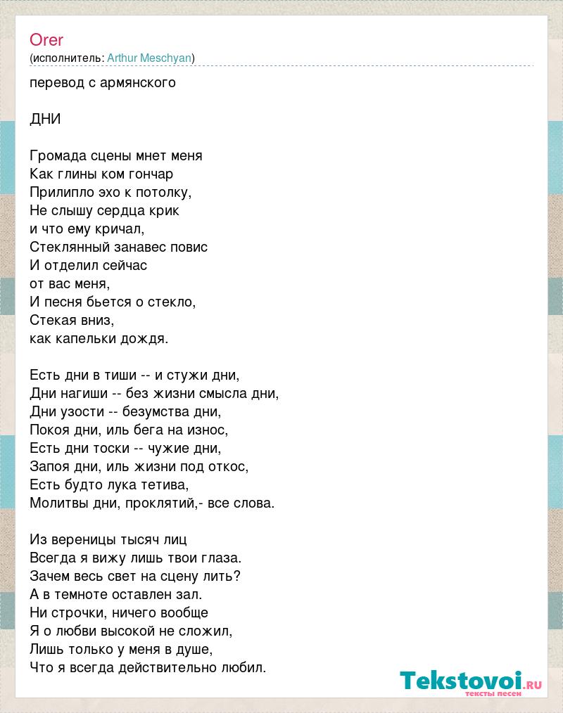 перевод с армянского ДНИ Громада сцены мнет меня Как глины ком гончар Прилипло эхо к потолку, Не слышу сердца крик и что ему кричал, Стеклянный занавес повис И отделил сейчас от вас меня, И песня бьется о стекло, Стекая вниз, как капельки дождя. Есть дни в тиши -- и стужи дни, Дни нагиши -- без жизни смысла дни, Дни узости -- безумства дни, Покоя дни, иль бега на износ, Есть дни тоски -- чужие дни, Запоя дни, иль жизни под откос, Есть будто лука тетива, Молитвы дни, проклятий,- все слова. Из вереницы тысяч лиц Всегда я вижу лишь твои глаза. Зачем весь свет на сцену лить? А в темноте оставлен зал. Ни строчки, ничего вообще Я о любви высокой не сложил, Лишь только у меня в душе, Что я всегда действительно любил.