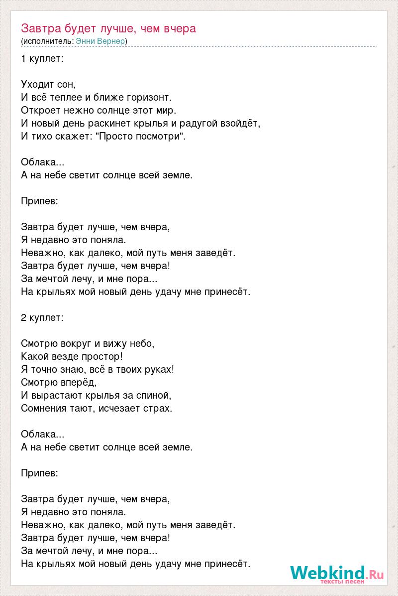 1 куплет: Уходит сон, И всё теплее и ближе горизонт. Откроет нежно солнце этот мир. И новый день раскинет крылья и радугой взойдёт, И тихо скажет: "Просто посмотри". Облака... А на небе светит солнце всей земле. Припев: Завтра будет лучше, чем вчера, Я недавно это поняла. Неважно, как далеко, мой путь меня заведёт. Завтра будет лучше, чем вчера! За мечтой лечу, и мне пора... На крыльях мой новый день удачу мне принесёт. 2 куплет: Смотрю вокруг и вижу небо, Какой везде простор! Я точно знаю, всё в твоих руках! Смотрю вперёд, И вырастают крылья за спиной, Сомнения тают, исчезает страх. Облака... А на небе светит солнце всей земле. Припев: Завтра будет лучше, чем вчера, Я недавно это поняла. Неважно, как далеко, мой путь меня заведёт. Завтра будет лучше, чем вчера! За мечтой лечу, и мне пора... На крыльях мой новый день удачу мне принесёт.