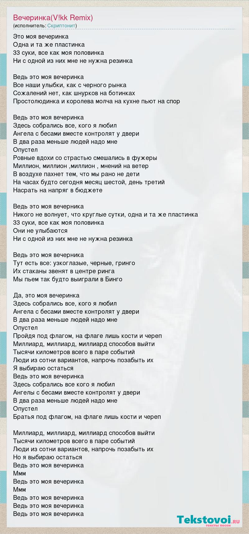 Это моя вечеринка Одна и та же пластинка 33 суки, все как моя половинка Ни с одной из них мне не нужна резинка Ведь это моя вечеринка Все наши улыбки, как с черного рынка Сожалений нет, как шнурков на ботинках Простолюдинка и королева молча на кухне пьют на спор Ведь это моя вечеринка Здесь собрались все, кого я любил Ангела с бесами вместе контролят у двери В два раза меньше людей надо мне Опустел Ровные вдохи со страстью смешались в фужеры Миллион, миллион ,миллион , мнений на ветер В воздухе пахнет тем, что мы рано не дети На часах будто сегодня месяц шестой, день третий Насрать на напряг в бюджете Ведь это моя вечерника Никого не волнует, что круглые сутки, одна и та же пластинка 33 суки, все как моя половинка Они не улыбаются Ни с одной из них мне не нужна резинка Ведь это моя вечерника Тут есть все: узкоглазые, черные, гринго Их стаканы звенят в центре ринга Мы пьем так будто выиграли в Бинго Да, это моя вечеринка Здесь собрались все, кого я любил Ангела с бесами вместе контролят у двери В два раза меньше людей надо мне Опустел Пройдя под флагом, на флаге лишь кости и череп Миллиард, миллиард, миллиард способов выйти Тысячи километров всего в паре событий Люди из сотни вариантов, напрочь позабыть их Я выбираю остаться Ведь это моя вечеринка Здесь собрались все кого я любил Ангелы с бесами вместе контролят у двери В два раза меньше людей надо мне Опустел Братья под флагом, на флаге лишь кости и череп Миллиард, миллиард, миллиард способов выйти Тысячи километров всего в паре событий Люди из сотни вариантов, напрочь позабыть их Но я выбираю остаться Ведь это моя вечеринка Ммм Ведь это моя вечеринка Ммм Ведь это моя вечеринка Ведь это моя вечеринка Ведь это моя вечеринка
