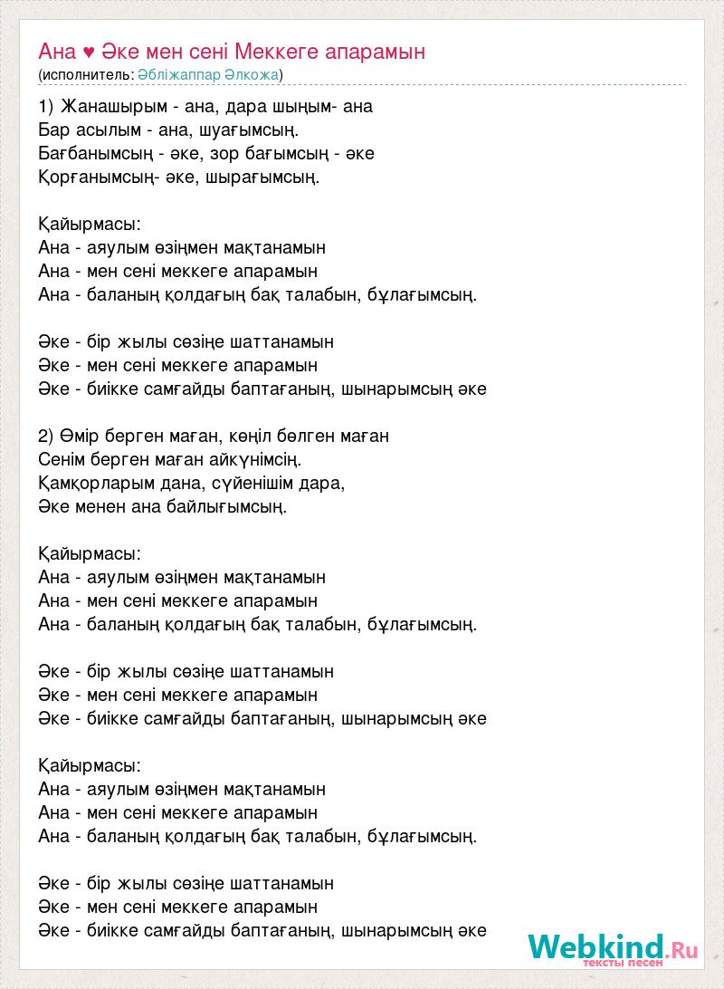 1) Жанашырым - ана, дара шыңым- ана Бар асылым - ана, шуағымсың. Бағбанымсың - әке, зор бағымсың - әке Қорғанымсың- әке, шырағымсың. Қайырмасы: Ана - аяулым өзіңмен мақтанамын Ана - мен сені меккеге апарамын Ана - баланың қолдағың бақ талабын, бұлағымсың. Әке - бір жылы сөзіңе шаттанамын Әке - мен сені меккеге апарамын Әке - биікке самғайды баптағаның, шынарымсың әке 2) Өмір берген маған, көңіл бөлген маған Сенім берген маған айкүнімсің. Қамқорларым дана, сүйенішім дара, Әке менен ана байлығымсың. Қайырмасы: Ана - аяулым өзіңмен мақтанамын Ана - мен сені меккеге апарамын Ана - баланың қолдағың бақ талабын, бұлағымсың. Әке - бір жылы сөзіңе шаттанамын Әке - мен сені меккеге апарамын Әке - биікке самғайды баптағаның, шынарымсың әке Қайырмасы: Ана - аяулым өзіңмен мақтанамын Ана - мен сені меккеге апарамын Ана - баланың қолдағың бақ талабын, бұлағымсың. Әке - бір жылы сөзіңе шаттанамын Әке - мен сені меккеге апарамын Әке - биікке самғайды баптағаның, шынарымсың әке