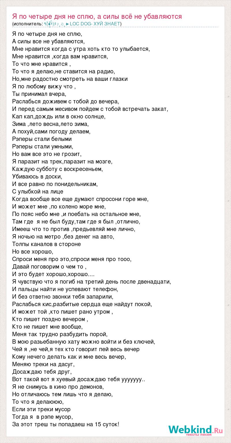 Я по четыре дня не сплю, А силы все не убавляются, Мне нравится когда с утра хоть кто то улыбается, Мне нравится ,когда вам нравится, То что мне нравится , То что я делаю,не ставится на радио, Но,мне радостно смотреть на ваши глазки Я по любому вижу что , Ты принимал вчера, Раслабься доживем с тобой до вечера, И перед самым месивом пойдем с тобой встречать закат, Кап кап,дождь или в окно солнце, Зима ,лето весна,лето зима, А похуй,сами погоду делаем, Рэперы стали белыми Рэперы стали умными, Но вам все это не грозит, Я паразит на трек,паразит на мозге, Каждую субботу с воскресеньем, Убиваюсь в доски, И все равно по понидельникам, С улыбкой на лице Когда вообще все еще думают спросони горе мне, И может мне ,по колено море мне, По пояс небо мне ,и поебать на остальное мне, Там где я не был буду,там где я был ,отлично, Имееш что то против ,предьевляй мне лично, Я ночью на метро ,без денег на авто, Толпы каналов в стороне Но все хорошо, Спроси меня про это,спроси меня про тооо, Давай поговорим о чем то , И это будет хорошо,хорошо.... Я чувствую что я погиб на третий день после двенадцати, И пальцы найти не успевают телефон, И без ответно звонки тебя запарили, Раслабься кис,разбитые сердца еще найдут покой, И может той ,кто пишет рано утром , Кто пишет поздно вечером , Кто не пишет мне вообще, Меня так трудно разбудить порой, В мою разьебанную хату можно войти и без ключей, Чей я ,не чей,я тех кто говорит пей весь вечер Кому нечего делать как и мне весь вечер, Меняю треки на дасуг, Досаждаю тебя друг, Вот такой вот я хуевый досаждаю тебя ууууууу.. Я не снимусь в кино про демонов, Но отличаюсь тем лишь что я делаю, То что я делаююю, Если эти треки мусор Тогда я в рэпе мусор, За этот треш ты попадаеш на 15 суток!