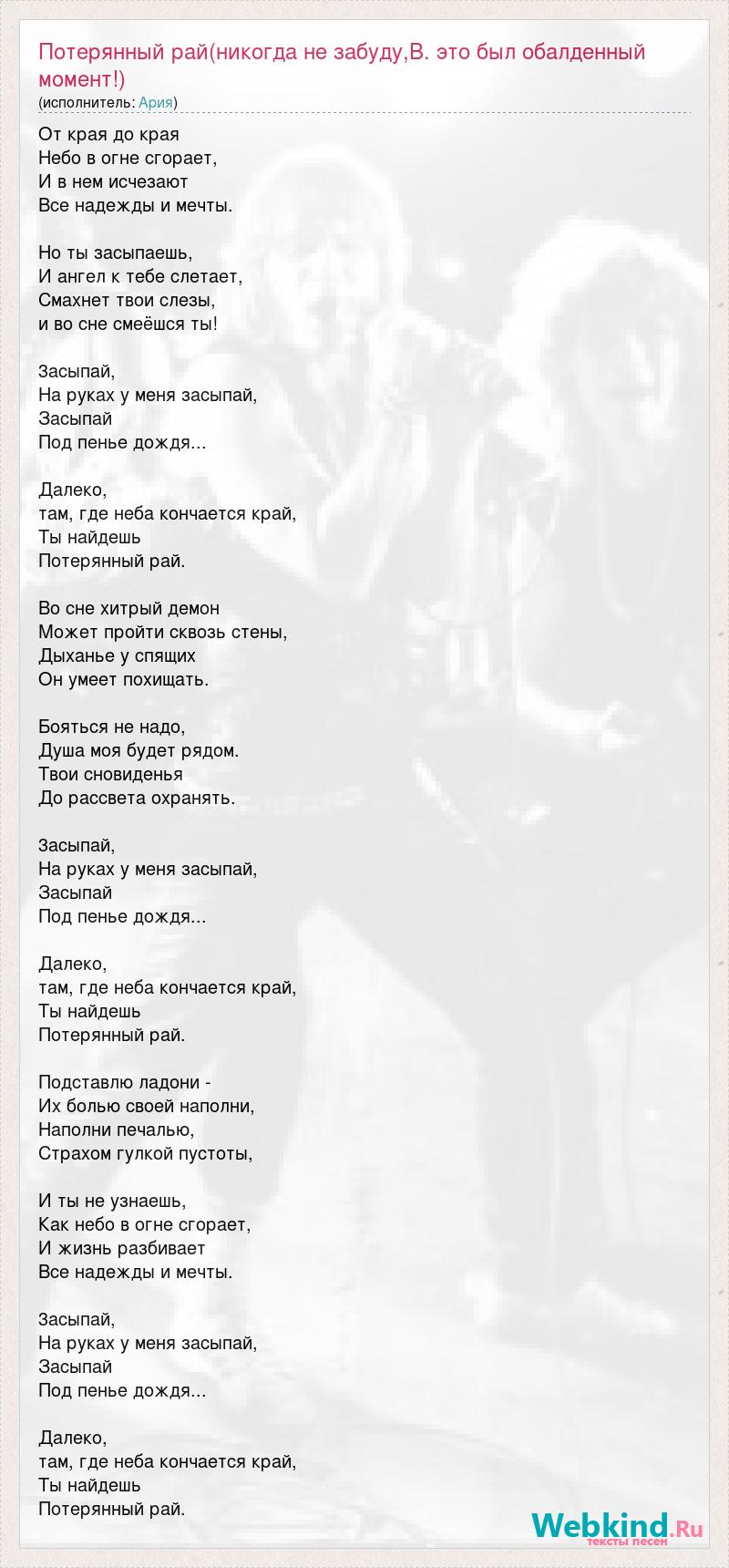 От края до края Небо в огне сгорает, И в нем исчезают Все надежды и мечты. Но ты засыпаешь, И ангел к тебе слетает, Смахнет твои слезы, и во сне смеёшся ты! 3асыпай, На руках у меня засыпай, Засыпай Под пенье дождя... Далеко, там, где неба кончается край, Ты найдешь Потерянный рай. Во сне хитрый демон Может пройти сквозь стены, Дыханье у спящих Он умеет похищать. Бояться не надо, Душа моя будет рядом. Твои сновиденья До рассвета охранять. 3асыпай, На руках у меня засыпай, Засыпай Под пенье дождя... Далеко, там, где неба кончается край, Ты найдешь Потерянный рай. Подставлю ладони - Их болью своей наполни, Наполни печалью, Страхом гулкой пустоты, И ты не узнаешь, Как небо в огне сгорает, И жизнь разбивает Все надежды и мечты. 3асыпай, На руках у меня засыпай, Засыпай Под пенье дождя... Далеко, там, где неба кончается край, Ты найдешь Потерянный рай.