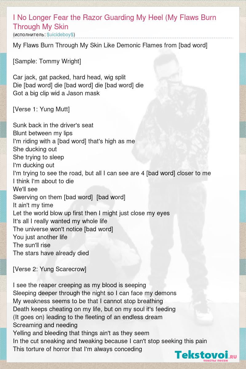 My Flaws Burn Through My Skin Like Demonic Flames from [bad word] [Sample: Tommy Wright] Car jack, gat packed, hard head, wig split Die [bad word] die [bad word] die [bad word] die Got a big clip wid a Jason mask [Verse 1: Yung Mutt] Sunk back in the driver's seat Blunt between my lips I'm riding with a [bad word] that's high as me She ducking out She trying to sleep I'm ducking out I'm trying to see the road, but all I can see are 4 [bad word] closer to me I think I'm about to die We'll see Swerving on them [bad word] [bad word] It ain't my time Let the world blow up first then I might just close my eyes It's all I really wanted my whole life The universe won't notice [bad word] You just another life The sun'll rise The stars have already died [Verse 2: Yung Scarecrow] I see the reaper creeping as my blood is seeping Sleeping deeper through the night so I can face my demons My weakness seems to be that I cannot stop breathing Death keeps cheating on my life, but on my soul it's feeding (It goes on) leading to the fleeting of an endless dream Screaming and needing Yelling and bleeding that things ain't as they seem In the cut sneaking and tweaking because I can't stop seeking this pain This torture of horror that I'm always conceding