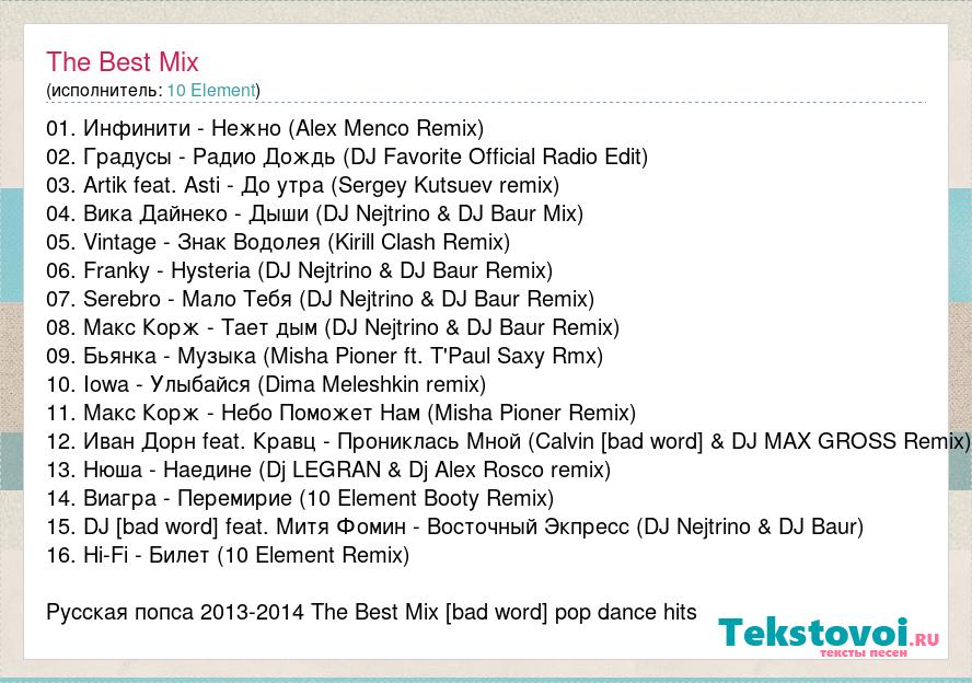 01. Инфинити - Нежно (Alex Menco Remix) 02. Градусы - Радио Дождь (DJ Favorite Official Radio Edit) 03. Artik feat. Asti - До утра (Sergey Kutsuev remix) 04. Вика Дайнеко - Дыши (DJ Nejtrino & DJ Baur Mix) 05. Vintage - Знак Водолея (Kirill Clash Remix) 06. Franky - Hysteria (DJ Nejtrino & DJ Baur Remix) 07. Serebro - Мало Тебя (DJ Nejtrino & DJ Baur Remix) 08. Макс Корж - Тает дым (DJ Nejtrino & DJ Baur Remix) 09. Бьянка - Музыка (Misha Pioner ft. T'Paul Saxy Rmx) 10. Iowa - Улыбайся (Dima Meleshkin remix) 11. Макс Корж - Небо Поможет Нам (Misha Pioner Remix) 12. Иван Дорн feat. Кравц - Прониклась Мной (Calvin [bad word] & DJ MAX GROSS Remix) 13. Нюша - Наедине (Dj LEGRAN & Dj Alex Rosco remix) 14. Виагра - Перемирие (10 Element Booty Remix) 15. DJ [bad word] feat. Митя Фомин - Восточный Экпресс (DJ Nejtrino & DJ Baur) 16. Hi-Fi - Билет (10 Element Remix) Русская попса 2013-2014 The Best Mix [bad word] pop dance hits