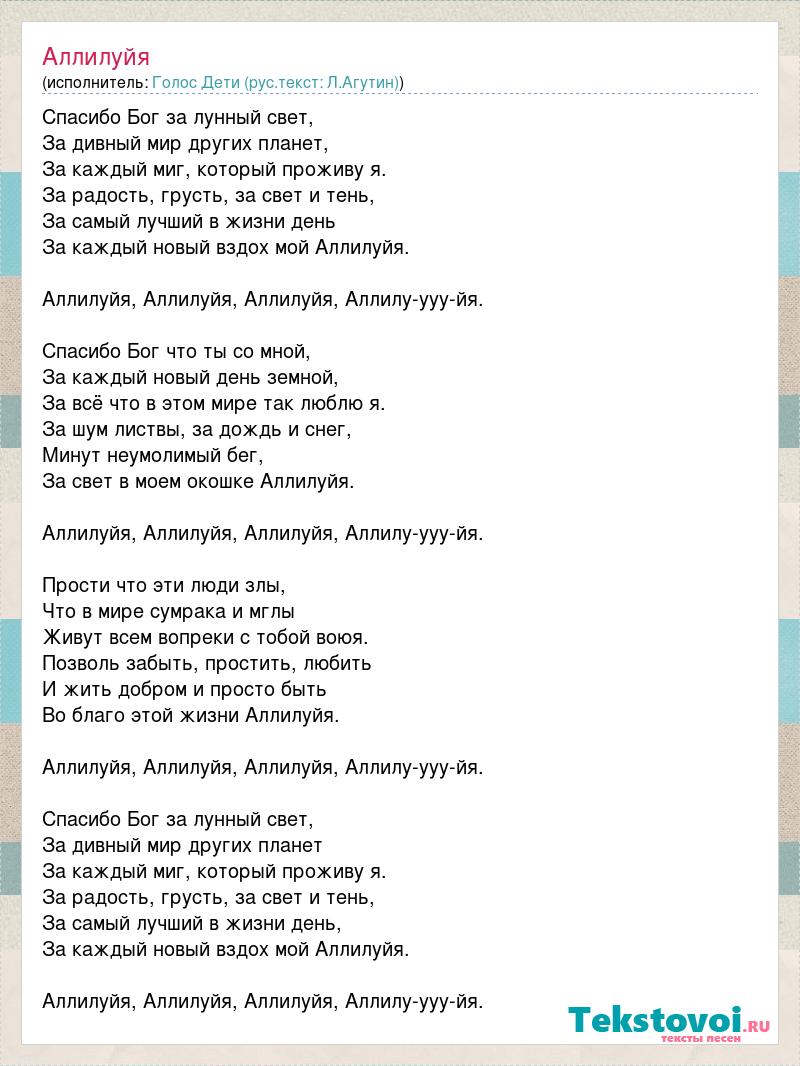 Спасибо Бог за лунный свет, За дивный мир других планет, За каждый миг, который проживу я. За радость, грусть, за свет и тень, За самый лучший в жизни день За каждый новый вздох мой Аллилуйя. Аллилуйя, Аллилуйя, Аллилуйя, Аллилу-ууу-йя. Спасибо Бог что ты со мной, За каждый новый день земной, За всё что в этом мире так люблю я. За шум листвы, за дождь и снег, Минут неумолимый бег, За свет в моем окошке Аллилуйя. Аллилуйя, Аллилуйя, Аллилуйя, Аллилу-ууу-йя. Прости что эти люди злы, Что в мире сумрака и мглы Живут всем вопреки с тобой воюя. Позволь забыть, простить, любить И жить добром и просто быть Во благо этой жизни Аллилуйя. Аллилуйя, Аллилуйя, Аллилуйя, Аллилу-ууу-йя. Спасибо Бог за лунный свет, За дивный мир других планет За каждый миг, который проживу я. За радость, грусть, за свет и тень, За самый лучший в жизни день, За каждый новый вздох мой Аллилуйя. Аллилуйя, Аллилуйя, Аллилуйя, Аллилу-ууу-йя.