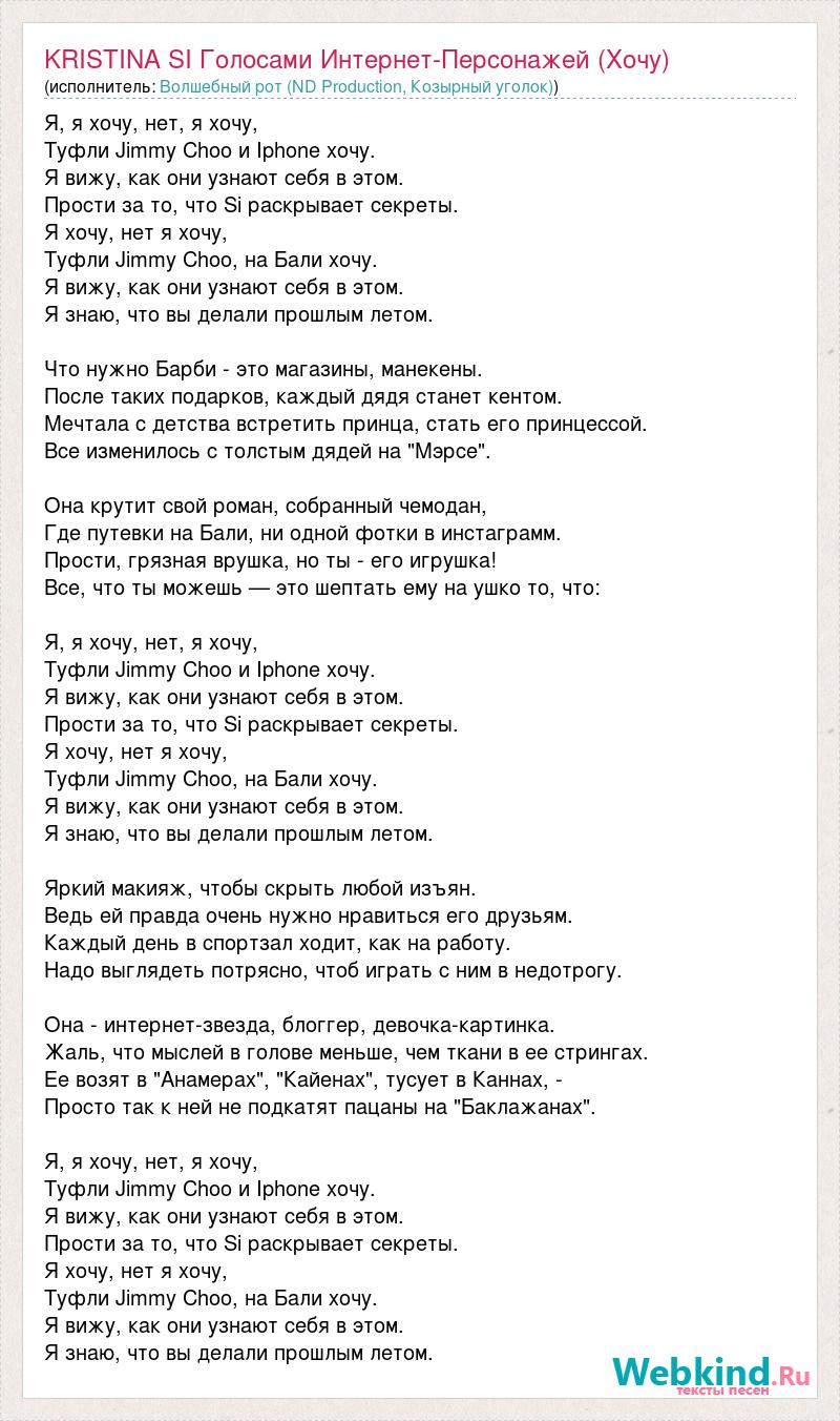 Я, я хочу, нет, я хочу, Туфли Jimmy Choo и Iphone хочу. Я вижу, как они узнают себя в этом. Прости за то, что Si раскрывает секреты. Я хочу, нет я хочу, Туфли Jimmy Choo, на Бали хочу. Я вижу, как они узнают себя в этом. Я знаю, что вы делали прошлым летом. Что нужно Барби - это магазины, манекены. После таких подарков, каждый дядя станет кентом. Мечтала с детства встретить принца, стать его принцессой. Все изменилось с толстым дядей на "Мэрсе". Она крутит свой роман, собранный чемодан, Где путевки на Бали, ни одной фотки в инстаграмм. Прости, грязная врушка, но ты - его игрушка! Все, что ты можешь — это шептать ему на ушко то, что: Я, я хочу, нет, я хочу, Туфли Jimmy Choo и Iphone хочу. Я вижу, как они узнают себя в этом. Прости за то, что Si раскрывает секреты. Я хочу, нет я хочу, Туфли Jimmy Choo, на Бали хочу. Я вижу, как они узнают себя в этом. Я знаю, что вы делали прошлым летом. Яркий макияж, чтобы скрыть любой изъян. Ведь ей правда очень нужно нравиться его друзьям. Каждый день в спортзал ходит, как на работу. Надо выглядеть потрясно, чтоб играть с ним в недотрогу. Она - интернет-звезда, блоггер, девочка-картинка. Жаль, что мыслей в голове меньше, чем ткани в ее стрингах. Ее возят в "Анамерах", "Кайенах", тусует в Каннах, - Просто так к ней не подкатят пацаны на "Баклажанах". Я, я хочу, нет, я хочу, Туфли Jimmy Choo и Iphone хочу. Я вижу, как они узнают себя в этом. Прости за то, что Si раскрывает секреты. Я хочу, нет я хочу, Туфли Jimmy Choo, на Бали хочу. Я вижу, как они узнают себя в этом. Я знаю, что вы делали прошлым летом.