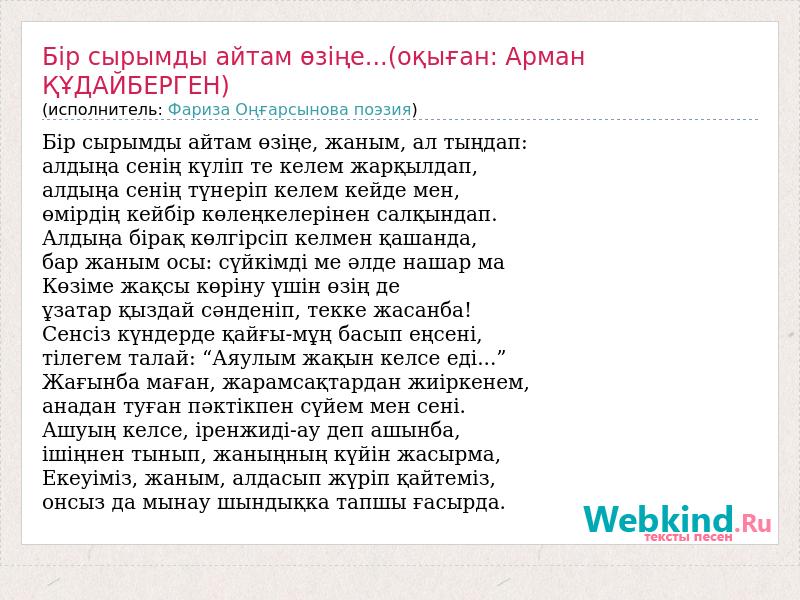 А как ты думаешь, о чем песня "Бір сырымды айтам өзіңе...(оқыған: Арман ҚҰДАЙБЕРГЕН)" ?