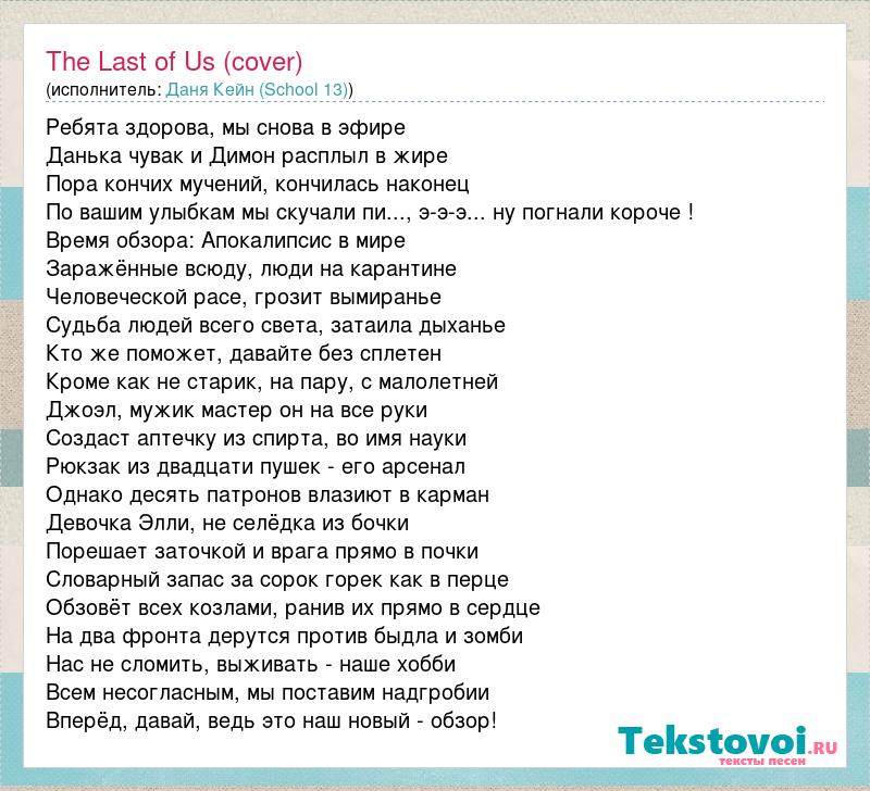 Ребята здорова, мы снова в эфире Данька чувак и Димон расплыл в жире Пора кончих мучений, кончилась наконец По вашим улыбкам мы скучали пи..., э-э-э... ну погнали короче ! Время обзора: Апокалипсис в мире Заражённые всюду, люди на карантине Человеческой расе, грозит вымиранье Судьба людей всего света, затаила дыханье Кто же поможет, давайте без сплетен Кроме как не старик, на пару, с малолетней Джоэл, мужик мастер он на все руки Создаст аптечку из спирта, во имя науки Рюкзак из двадцати пушек - его арсенал Однако десять патронов влазиют в карман Девочка Элли, не селёдка из бочки Порешает заточкой и врага прямо в почки Словарный запас за сорок горек как в перце Обзовёт всех козлами, ранив их прямо в сердце На два фронта дерутся против быдла и зомби Нас не сломить, выживать - наше хобби Всем несогласным, мы поставим надгробии Вперёд, давай, ведь это наш новый - обзор!