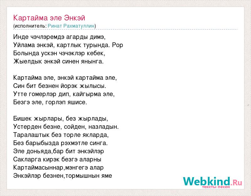 Инде чэчлэремдэ агарды димэ, Уйлама энкэй, картлык турында. Рор Болында ускэн чэчэклэр кебек, Жыелдык энкэй синен янынга. Картайма эле, энкэй картайма эле, Син бит безнен йорэк жылысы. Утте гомерлэр дип, кайгырма эле, Безгэ эле, горлэп яшисе. Бишек жырлары, без жырлады, Устерден безне, сойден, назладын. Таралаштык без торле якларда, Без барыбызда рэхмэтле синга. Эле доньяда,бар бит энкэйлэр Сакларга кирэк безгэ аларны Картаймасыннар,мэнгегэ алар Энкэйлэр безнен,тормышнын яме