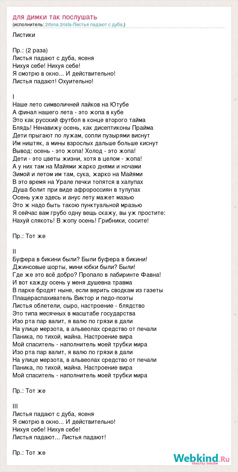 Листики Пр.: (2 раза) Листья падают с дуба, ясеня Нихуя себе! Нихуя себе! Я смотрю в окно... И действительно! Листья падают! Охуительно! I Наше лето символичней лайков на Ютубе А финал нашего лета - это жопа в кубе Это как русский футбол в конце второго тайма Блядь! Ненавижу осень, как дисептиконы Прайма Дети прыгают по лужам, сопли пузырями виснут Им ништяк, а мины взрослых дальше больше киснут Вывод: осень - это жопа! Холод - это жопа! Дети - это цветы жизни, хотя в целом - жопа! А у них там на Майями жарко днями и ночами Зимой и летом им там, сука, жарко на Майями В это время на Урале печки топятся в халупах Душа болит при виде афророссиян в тулупах Осень уже здесь и анус лету мажет мазью Это ж надо быть такою пунктуальной мразью Я сейчас вам грубо одну вещь скажу, вы уж простите: Нахуй слякоть! В жопу осень! Грибники, сосите! Пр.: Тот же II Буфера в бикини были? Были буфера в бикини! Джинсовые шорты, мини юбки были? Были! Где же это всё добро? Пропало в лабиринте Фавна! И вот кажду осень у меня душевна травма В парке бродят ныне, если верить сводкам из газеты Плащераспахиватель Виктор и педо-поэты Листья облетели, сыро, настроение - блядство Это типа месячных в масштабе государства Изо рта пар валит, я валю по грязи в дали На улице мерзота, в альвеолах средство от печали Паника, по тихой, майна. Настроение вира Мой спаситель - наполнитель моей трубки мира Изо рта пар валит, я валю по грязи в дали На улице мерзота, в альвеолах средство от печали Паника, по тихой, майна. Настроение вира Мой спаситель - наполнитель моей трубки мира Пр.: Тот же III Листья падают с дуба, ясеня Я смотрю в окно... И действительно! Нихуя себе! Нихуя себе! Листья падают... Листья падают! Пр.: Тот же