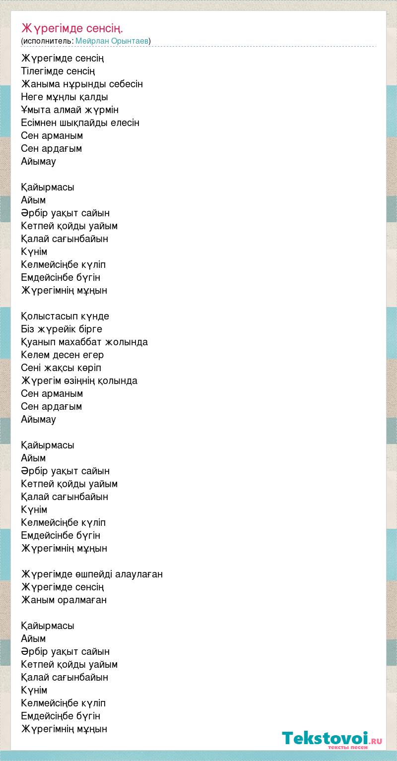 Жүрегімде сенсің Тілегімде сенсің Жаныма нұрынды себесін Неге мұңлы қалды Ұмыта алмай жүрмін Есімнен шықпайды елесін Сен арманым Сен ардағым Айымау Қайырмасы Айым Əрбір уақыт сайын Кетпей қойды уайым Қалай сағынбайын Күнім Келмейсіңбе күліп Емдейсінбе бүгін Жүрегімнің мұңын Қолыстасып күнде Біз жүрейік бірге Қуанып махаббат жолында Келем десен егер Сені жақсы көріп Жүрегім өзіңнің қолында Сен арманым Сен ардағым Айымау Қайырмасы Айым Əрбір уақыт сайын Кетпей қойды уайым Қалай сағынбайын Күнім Келмейсіңбе күліп Емдейсінбе бүгін Жүрегімнің мұңын Жүрегімде өшпейді алаулаған Жүрегімде сенсің Жаным оралмаған Қайырмасы Айым Əрбір уақыт сайын Кетпей қойды уайым Қалай сағынбайын Күнім Келмейсіңбе күліп Емдейсіңбе бүгін Жүрегімнің мұңын