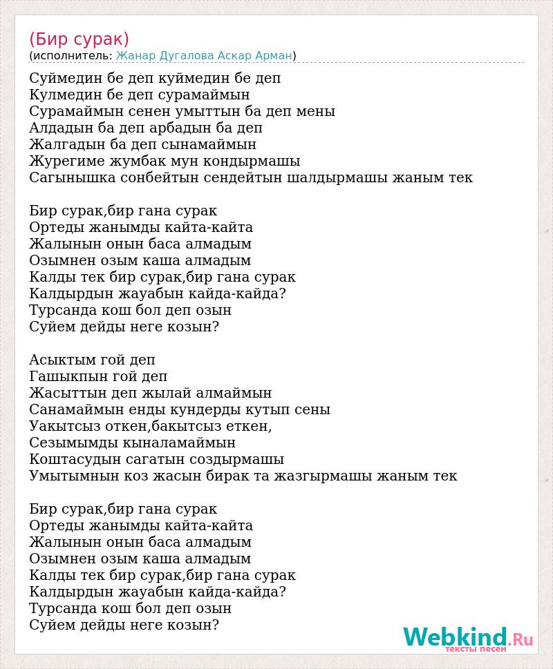 Суймедин бе деп куймедин бе деп Кулмедин бе деп сурамаймын Сурамаймын сенен умыттын ба деп мены Алдадын ба деп арбадын ба деп Жалгадын ба деп сынамаймын Журегиме жумбак мун кондырмашы Сагынышка сонбейтын сендейтын шалдырмашы жаным тек Бир сурак,бир гана сурак Ортеды жанымды кайта-кайта Жалынын онын баса алмадым Озымнен озым каша алмадым Калды тек бир сурак,бир гана сурак Калдырдын жауабын кайда-кайда? Турсанда кош бол деп озын Суйем дейды неге козын? Асыктым гой деп Гашыкпын гой деп Жасыттын деп жылай алмаймын Санамаймын енды кундерды кутып сены Уакытсыз откен,бакытсыз еткен, Сезымымды кыналамаймын Коштасудын сагатын создырмашы Умытымнын коз жасын бирак та жазгырмашы жаным тек Бир сурак,бир гана сурак Ортеды жанымды кайта-кайта Жалынын онын баса алмадым Озымнен озым каша алмадым Калды тек бир сурак,бир гана сурак Калдырдын жауабын кайда-кайда? Турсанда кош бол деп озын Суйем дейды неге козын?