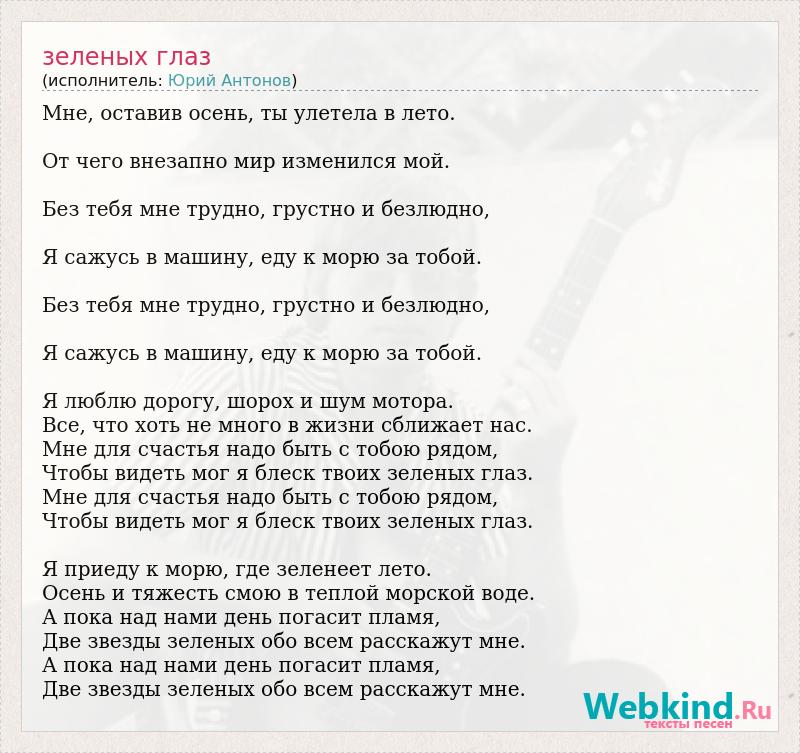 Мне, оставив осень, ты улетела в лето. От чего внезапно мир изменился мой. Без тебя мне трудно, грустно и безлюдно, Я сажусь в машину, еду к морю за тобой. Без тебя мне трудно, грустно и безлюдно, Я сажусь в машину, еду к морю за тобой. Я люблю дорогу, шорох и шум мотора. Все, что хоть не много в жизни сближает нас. Мне для счастья надо быть с тобою рядом, Чтобы видеть мог я блеск твоих зеленых глаз. Мне для счастья надо быть с тобою рядом, Чтобы видеть мог я блеск твоих зеленых глаз. Я приеду к морю, где зеленеет лето. Осень и тяжесть смою в теплой морской воде. А пока над нами день погасит пламя, Две звезды зеленых обо всем расскажут мне. А пока над нами день погасит пламя, Две звезды зеленых обо всем расскажут мне.