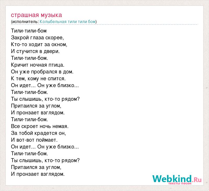 Тили-тили-бом Закрой глаза скорее, Кто-то ходит за окном, И стучится в двери. Тили-тили-бом. Кричит ночная птица. Он уже пробрался в дом. К тем, кому не спится. Он идет... Он уже близко... Тили-тили-бом. Ты слышишь, кто-то рядом? Притаился за углом, И пронзает взглядом. Тили-тили-бом. Все скроет ночь немая. За тобой крадется он, И вот-вот поймает. Он идет... Он уже близко... Тили-тили-бом. Ты слышишь, кто-то рядом? Притаился за углом, И пронзает взглядом.