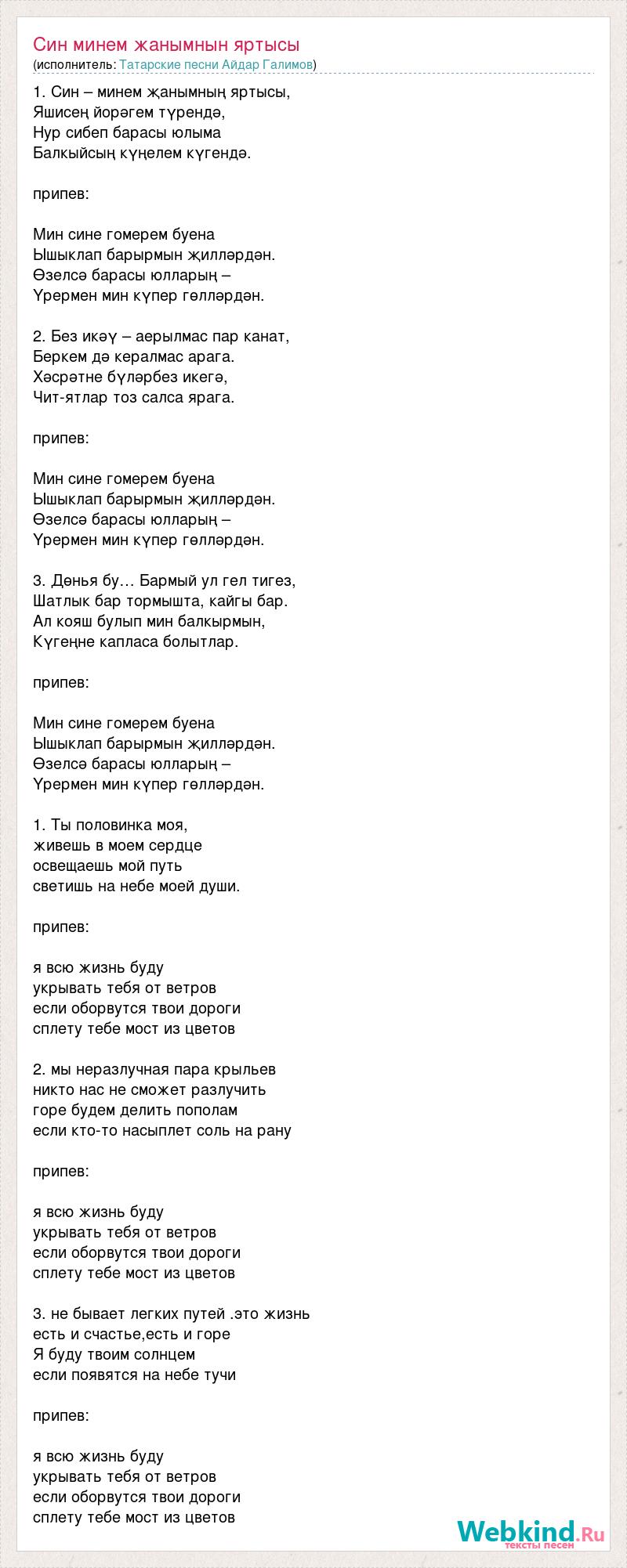 1. Син – минем җанымның яртысы, Яшисең йорәгем түрендә, Нур сибеп барасы юлыма Балкыйсың күңелем күгендә. припев: Мин сине гомерем буена Ышыклап барырмын җилләрдән. Өзелсә барасы юлларың – Үрермен мин күпер гөлләрдән. 2. Без икәү – аерылмас пар канат, Беркем дә кералмас арага. Хәсрәтне бүләрбез икегә, Чит-ятлар тоз салса ярага. припев: Мин сине гомерем буена Ышыклап барырмын җилләрдән. Өзелсә барасы юлларың – Үрермен мин күпер гөлләрдән. 3. Дөнья бу… Бармый ул гел тигез, Шатлык бар тормышта, кайгы бар. Ал кояш булып мин балкырмын, Күгеңне капласа болытлар. припев: Мин сине гомерем буена Ышыклап барырмын җилләрдән. Өзелсә барасы юлларың – Үрермен мин күпер гөлләрдән. 1. Ты половинка моя, живешь в моем сердце освещаешь мой путь светишь на небе моей души. припев: я всю жизнь буду укрывать тебя от ветров если оборвутся твои дороги сплету тебе мост из цветов 2. мы неразлучная пара крыльев никто нас не сможет разлучить горе будем делить пополам если кто-то насыплет соль на рану припев: я всю жизнь буду укрывать тебя от ветров если оборвутся твои дороги сплету тебе мост из цветов 3. не бывает легких путей .это жизнь есть и счастье,есть и горе Я буду твоим солнцем если появятся на небе тучи припев: я всю жизнь буду укрывать тебя от ветров если оборвутся твои дороги сплету тебе мост из цветов