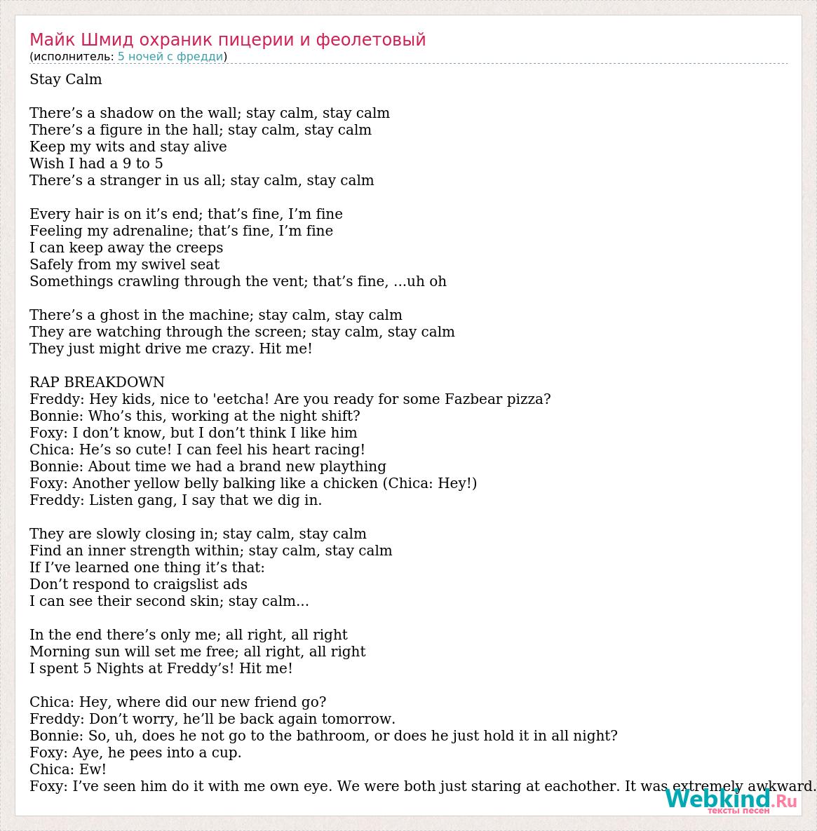 Stay Calm There’s a shadow on the wall; stay calm, stay calm There’s a figure in the hall; stay calm, stay calm Keep my wits and stay alive Wish I had a 9 to 5 There’s a stranger in us all; stay calm, stay calm Every hair is on it’s end; that’s fine, I’m fine Feeling my adrenaline; that’s fine, I’m fine I can keep away the creeps Safely from my swivel seat Somethings crawling through the vent; that’s fine, ...uh oh There’s a ghost in the machine; stay calm, stay calm They are watching through the screen; stay calm, stay calm They just might drive me crazy. Hit me! RAP BREAKDOWN Freddy: Hey kids, nice to 'eetcha! Are you ready for some Fazbear pizza? Bonnie: Who’s this, working at the night shift? Foxy: I don’t know, but I don’t think I like him Chica: He’s so cute! I can feel his heart racing! Bonnie: About time we had a brand new plaything Foxy: Another yellow belly balking like a chicken (Chica: Hey!) Freddy: Listen gang, I say that we dig in. They are slowly closing in; stay calm, stay calm Find an inner strength within; stay calm, stay calm If I’ve learned one thing it’s that: Don’t respond to craigslist ads I can see their second skin; stay calm... In the end there’s only me; all right, all right Morning sun will set me free; all right, all right I spent 5 Nights at Freddy’s! Hit me! Chica: Hey, where did our new friend go? Freddy: Don’t worry, he’ll be back again tomorrow. Bonnie: So, uh, does he not go to the bathroom, or does he just hold it in all night? Foxy: Aye, he pees into a cup. Chica: Ew! Foxy: I’ve seen him do it with me own eye. We were both just staring at eachother. It was extremely awkward.