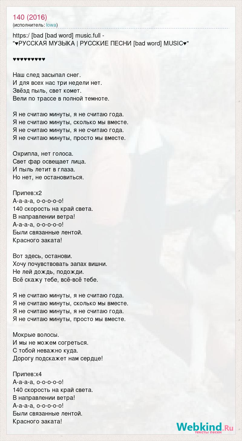 https:/ [bad [bad word] music.full - "♥РУССКАЯ МУЗЫКА | РУССКИЕ ПЕСНИ [bad word] MUSIC♥" ♥♥♥♥♥♥♥♥♥ Наш след засыпал снег. И для всех нас три недели нет. Звёзд пыль, свет комет. Вели по трассе в полной темноте. Я не считаю минуты, я не считаю года. Я не считаю минуты, сколько мы вместе. Я не считаю минуты, я не считаю года. Я не считаю минуты, просто мы вместе. Охрипла, нет голоса. Свет фар освещает лица. И пыль летит в глаза. Но нет, не остановиться. Припев:х2 А-а-а-а, о-о-о-о-о! 140 скорость на край света. В направлении ветра! А-а-а-а, о-о-о-о-о! Были связанные лентой. Красного заката! Вот здесь, останови. Хочу почувствовать запах вишни. Не лей дождь, подожди. Всё скажу тебе, всё-всё тебе. Я не считаю минуты, я не считаю года. Я не считаю минуты, сколько мы вместе. Я не считаю минуты, я не считаю года. Я не считаю минуты, просто мы вместе. Мокрые волосы. И мы не можем согреться. С тобой неважно куда. Дорогу подскажет нам сердце! Припев:х4 А-а-а-а, о-о-о-о-о! 140 скорость на край света. В направлении ветра! А-а-а-а, о-о-о-о-о! Были связанные лентой. Красного заката!