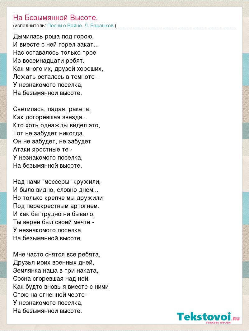 Дымилась роща под горою, И вместе с ней горел закат... Нас оставалось только трое Из восемнадцати ребят. Как много их, друзей хороших, Лежать осталось в темноте - У незнакомого поселка, На безымянной высоте. Светилась, падая, ракета, Как догоревшая звезда... Кто хоть однажды видел это, Тот не забудет никогда. Он не забудет, не забудет Атаки яростные те - У незнакомого поселка, На безымянной высоте. Над нами "мессеры" кружили, И было видно, словно днем... Но только крепче мы дружили Под перекрестным артогнем. И как бы трудно ни бывало, Ты верен был своей мечте - У незнакомого поселка, На безымянной высоте. Мне часто снятся все ребята, Друзья моих военных дней, Землянка наша в три наката, Сосна сгоревшая над ней. Как будто вновь я вместе с ними Стою на огненной черте - У незнакомого поселка, На безымянной высоте.