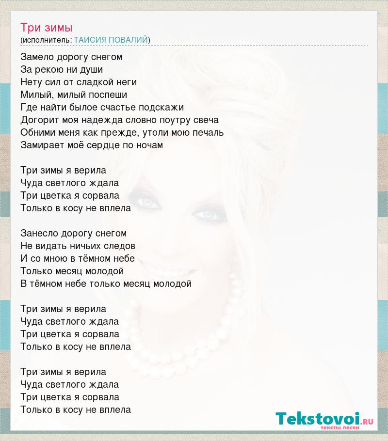 Замело дорогу снегом За рекою ни души Нету сил от сладкой неги Милый, милый поспеши Где найти былое счастье подскажи Догорит моя надежда словно поутру свеча Обними меня как прежде, утоли мою печаль Замирает моё сердце по ночам Три зимы я верила Чуда светлого ждала Три цветка я сорвала Только в косу не вплела Занесло дорогу снегом Не видать ничьих следов И со мною в тёмном небе Только месяц молодой В тёмном небе только месяц молодой Три зимы я верила Чуда светлого ждала Три цветка я сорвала Только в косу не вплела Три зимы я верила Чуда светлого ждала Три цветка я сорвала Только в косу не вплела