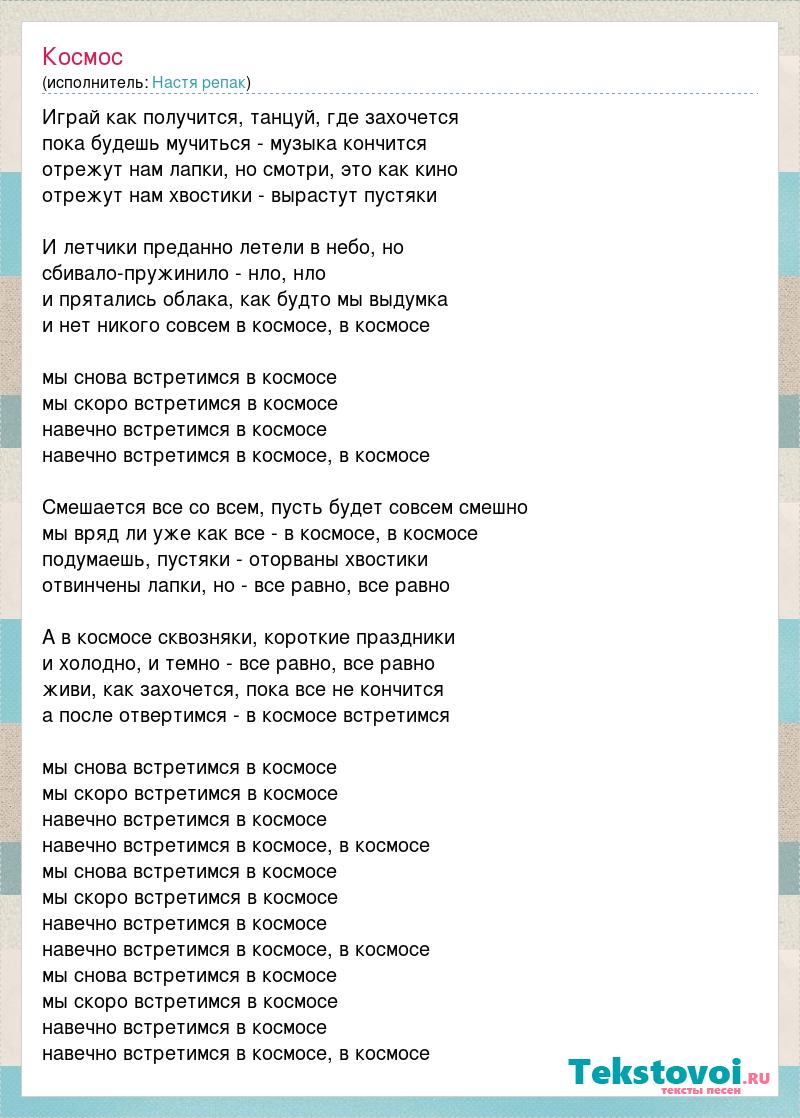 Играй как получится, танцуй, где захочется пока будешь мучиться - музыка кончится отрежут нам лапки, но смотри, это как кино отрежут нам хвостики - вырастут пустяки И летчики преданно летели в небо, но сбивало-пружинило - нло, нло и прятались облака, как будто мы выдумка и нет никого совсем в космосе, в космосе мы снова встретимся в космосе мы скоро встретимся в космосе навечно встретимся в космосе навечно встретимся в космосе, в космосе Смешается все со всем, пусть будет совсем смешно мы вряд ли уже как все - в космосе, в космосе подумаешь, пустяки - оторваны хвостики отвинчены лапки, но - все равно, все равно А в космосе сквозняки, короткие праздники и холодно, и темно - все равно, все равно живи, как захочется, пока все не кончится а после отвертимся - в космосе встретимся мы снова встретимся в космосе мы скоро встретимся в космосе навечно встретимся в космосе навечно встретимся в космосе, в космосе мы снова встретимся в космосе мы скоро встретимся в космосе навечно встретимся в космосе навечно встретимся в космосе, в космосе мы снова встретимся в космосе мы скоро встретимся в космосе навечно встретимся в космосе навечно встретимся в космосе, в космосе