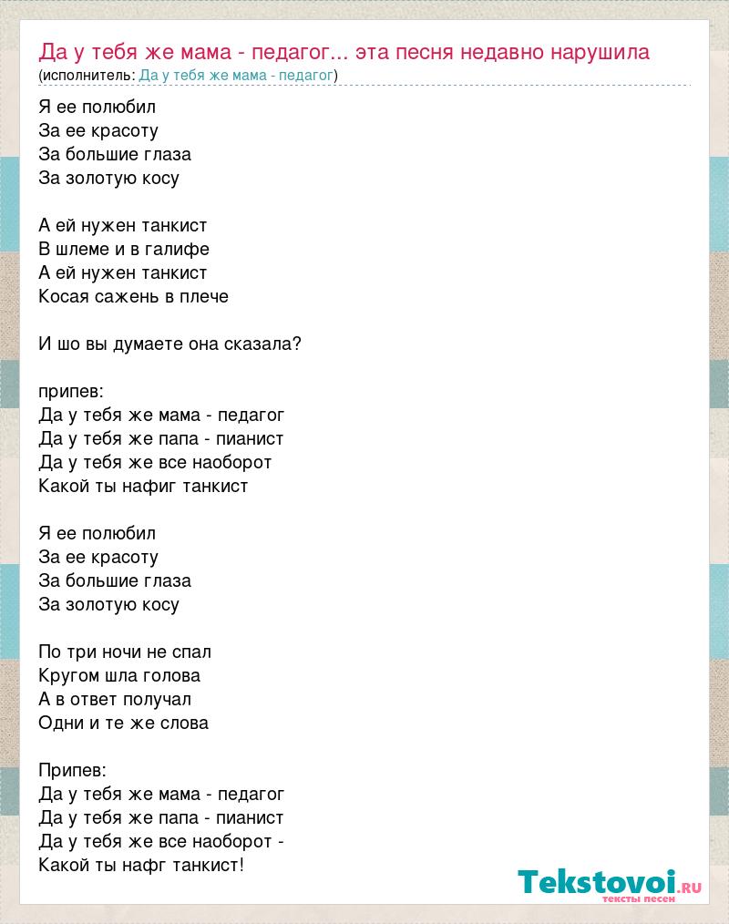 Я ее полюбил За ее красоту За большие глаза За золотую косу А ей нужен танкист В шлеме и в галифе А ей нужен танкист Косая сажень в плече И шо вы думаете она сказала? припев: Да у тебя же мама - педагог Да у тебя же папа - пианист Да у тебя же все наоборот Какой ты нафиг танкист Я ее полюбил За ее красоту За большие глаза За золотую косу По три ночи не спал Кругом шла голова А в ответ получал Одни и те же слова Припев: Да у тебя же мама - педагог Да у тебя же папа - пианист Да у тебя же все наоборот - Какой ты нафг танкист!