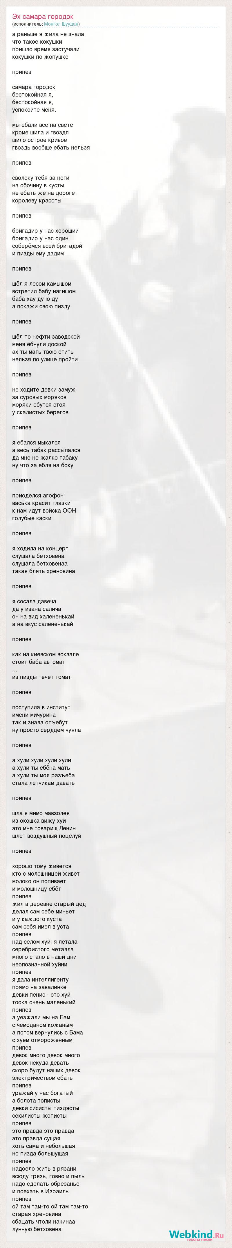 а раньше я жила не знала что такое кокушки пришло время застучали кокушки по жопушке припев самара городок беспокойная я, беспокойная я, успокойте меня. мы ебали все на свете кроме шила и гвоздя шило острое кривое гвоздь вообще ебать нельзя припев сволоку тебя за ноги на обочину в кусты не ебать же на дороге королеву красоты припев бригадир у нас хороший бригадир у нас один соберёмся всей бригадой и пизды ему дадим припев шёл я лесом камышом встретил бабу нагишом баба хау ду ю ду а покажи свою пизду припев шёл по нефти заводской меня ёбнули доской ах ты мать твою етить нельзя по улице пройти припев не ходите девки замуж за суровых моряков моряки ебутся стоя у скалистых берегов припев я ебался мыкался а весь табак рассыпался да мне не жалко табаку ну что за ебля на боку припев приоделся агофон васька красит глазки к нам идут войска ООН голубые каски припев я ходила на концерт слушала бетховена слушала бетховенаа такая блять хреновина припев я сосала давеча да у ивана салича он на вид халененькай а на вкус салёненькай припев как на киевском вокзале стоит баба автомат ... из пизды течет томат припев поступила в институт имени мичурина так и знала отъебут ну просто сердцем чуяла припев а хули хули хули хули а хули ты ебёна мать а хули ты моя разъеба стала летчикам давать припев шла я мимо мавзолея из окошка вижу хуй это мне товарищ Ленин шлет воздушный поцелуй припев хорошо тому живется кто с молошницей живет молоко он попивает и молошницу ебёт припев жил в деревне старый дед делал сам себе миньет и у каждого куста сам себя имел в уста припев над селом хуйня летала серебристого металла много стало в наши дни неопознанной хуйни припев я дала интеллигенту прямо на завалинке девки пенис - это хуй тоока очень маленький припев а уезжали мы на Бам с чемоданом кожаным а потом вернулись с Бама с хуем отмороженным припев девок много девок много девок некуда девать скоро будут наших девок электричеством ебать припев уражай у нас богатый а болота тописты девки сисисты пиздясты секилисты жописты припев это правда это правда это правда сущая хоть сама и небольшая но пизда большущая припев надоело жить в рязани всюду грязь, говно и пыль надо сделать обрезанье и поехать в Израиль припев ой там там-то ой там там-то старая хреновина сбацать чтоли начинаа лунную бетховена