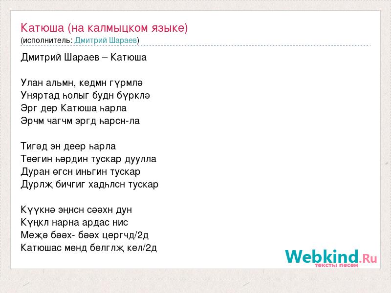 Дмитрий Шараев – Катюша Улан альмн, кедмн гүрмлә Уняртад һолыг будн бүрклә Эрг дер Катюша һарла Эрчм чагчм эргд һарсн-ла Тигәд эн деер һарла Теегин һәрдин тускар дуулла Дуран өгсн иньгин тускар Дурлҗ бичгиг хадһлсн тускар Күүкнә эңнсн сәәхн дун Күңкл нарна ардас нис Меҗә бәәх- бәәх цергчд/2д Катюшас менд белглҗ кел/2д