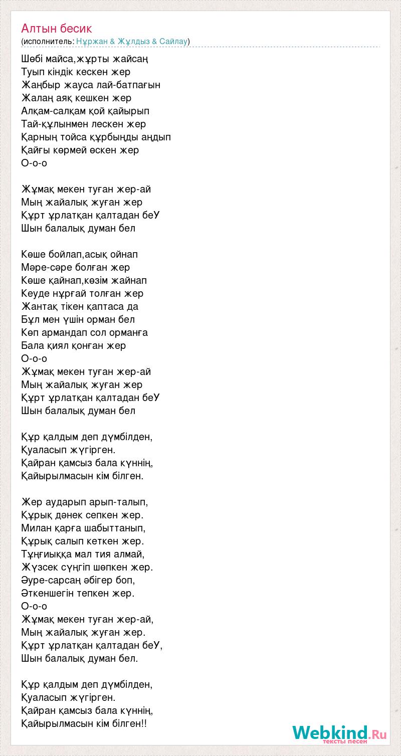 Шөбі майса,жұрты жайсаң Туып кіндік кескен жер Жаңбыр жауса лай-батпағын Жалаң аяқ кешкен жер Алқам-салқам қой қайырып Тай-құлынмен лескен жер Қарның тойса құрбыңды аңдып Қайғы көрмей өскен жер О-о-о Жұмақ мекен туған жер-ай Мың жайалық жуған жер Құрт ұрлатқан қалтадан беУ Шын балалық думан бел Көше бойлап,асық ойнап Мәре-сәре болған жер Көше қайнап,көзім жайнап Кеуде нұрғай толған жер Жантақ тікен қаптаса да Бұл мен үшін орман бел Көп армандап сол орманға Бала қиял қонған жер О-о-о Жұмақ мекен туған жер-ай Мың жайалық жуған жер Құрт ұрлатқан қалтадан беУ Шын балалық думан бел Құр қалдым деп дүмбілден, Қуаласып жүгірген. Қайран қамсыз бала күннің, Қайырылмасын кім білген. Жер аударып арып-талып, Құрық дәнек сепкен жер. Милан қарға шабыттанып, Құрық салып кеткен жер. Тұңғиыққа мал тия алмай, Жүзсек сүңгіп шөпкен жер. Әуре-сарсаң әбігер боп, Әткеншегін тепкен жер. О-о-о Жұмақ мекен туған жер-ай, Мың жайалық жуған жер. Құрт ұрлатқан қалтадан беУ, Шын балалық думан бел. Құр қалдым деп дүмбілден, Қуаласып жүгірген. Қайран қамсыз бала күннің, Қайырылмасын кім білген!!