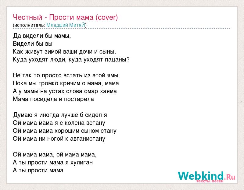 Да видели бы мамы, Видели бы вы Как живут зимой ваши дочи и сыны. Куда уходят люди, куда уходят пацаны? Не так то просто встать из этой ямы Пока мы громко кричим о мама, мама А у мамы на устах слова омар хаяма Мама посидела и постарела Думаю я иногда лучше б сидел я Ой мама мама я с колена встану Ой мама мама хорошим сыном стану Ой мама ни ногой к авганистану Ой мама мама, ой мама мама, А ты прости мама я хулиган А ты прости мама