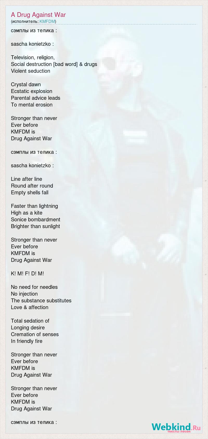 сэмплы из телика : sascha konietzko : Television, religion, Social destruction [bad word] & drugs Violent seduction Crystal dawn Ecstatic explosion Parental advice leads To mental erosion Stronger than never Ever before KMFDM is Drug Against War сэмплы из телика : sascha konietzko : Line after line Round after round Empty shells fall Faster than lightning High as a kite Sonice bombardment Brighter than sunlight Stronger than never Ever before KMFDM is Drug Against War K! M! F! D! M! No need for needles No injection The substance substitutes Love & affection Total sedation of Longing desire Cremation of senses In friendly fire Stronger than never Ever before KMFDM is Drug Against War Stronger than never Ever before KMFDM is Drug Against War сэмплы из телика :