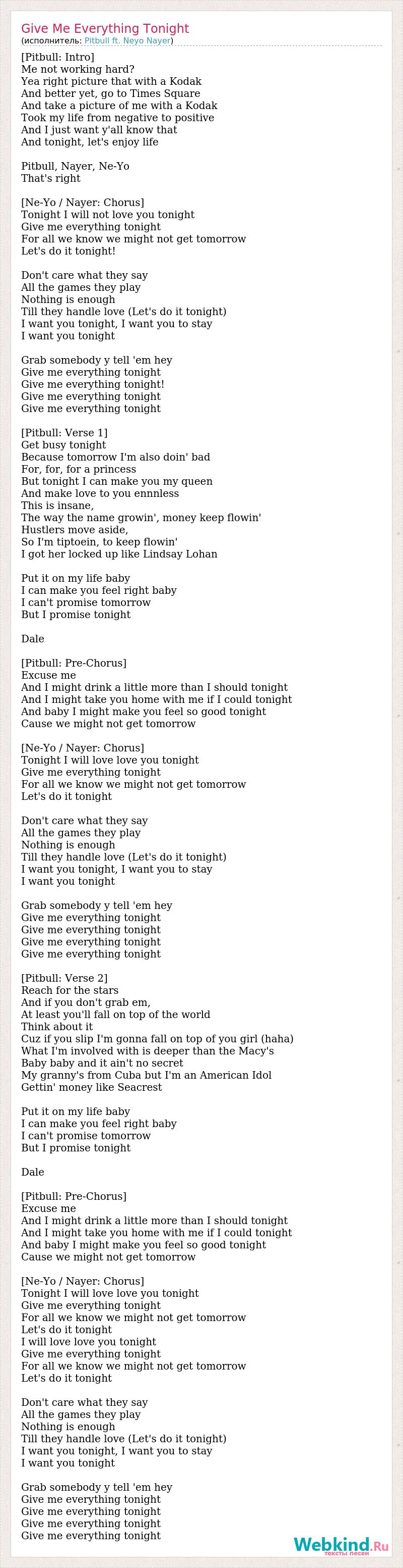 [Pitbull: Intro] Me not working hard? Yea right picture that with a Kodak And better yet, go to Times Square And take a picture of me with a Kodak Took my life from negative to positive And I just want y'all know that And tonight, let's enjoy life Pitbull, Nayer, Ne-Yo That's right [Ne-Yo / Nayer: Chorus] Tonight I will not love you tonight Give me everything tonight For all we know we might not get tomorrow Let's do it tonight! Don't care what they say All the games they play Nothing is enough Till they handle love (Let's do it tonight) I want you tonight, I want you to stay I want you tonight Grab somebody y tell 'em hey Give me everything tonight Give me everything tonight! Give me everything tonight Give me everything tonight [Pitbull: Verse 1] Get busy tonight Because tomorrow I'm also doin' bad For, for, for a princess But tonight I can make you my queen And make love to you ennnless This is insane, The way the name growin', money keep flowin' Hustlers move aside, So I'm tiptoein, to keep flowin' I got her locked up like Lindsay Lohan Put it on my life baby I can make you feel right baby I can't promise tomorrow But I promise tonight Dale [Pitbull: Pre-Chorus] Excuse me And I might drink a little more than I should tonight And I might take you home with me if I could tonight And baby I might make you feel so good tonight Cause we might not get tomorrow [Ne-Yo / Nayer: Chorus] Tonight I will love love you tonight Give me everything tonight For all we know we might not get tomorrow Let's do it tonight Don't care what they say All the games they play Nothing is enough Till they handle love (Let's do it tonight) I want you tonight, I want you to stay I want you tonight Grab somebody y tell 'em hey Give me everything tonight Give me everything tonight Give me everything tonight Give me everything tonight [Pitbull: Verse 2] Reach for the stars And if you don't grab em, At least you'll fall on top of the world Think about it Cuz if you slip I'm gonna fall on top of you girl (haha) What I'm involved with is deeper than the Macy's Baby baby and it ain't no secret My granny's from Cuba but I'm an American Idol Gettin' money like Seacrest Put it on my life baby I can make you feel right baby I can't promise tomorrow But I promise tonight Dale [Pitbull: Pre-Chorus] Excuse me And I might drink a little more than I should tonight And I might take you home with me if I could tonight And baby I might make you feel so good tonight Cause we might not get tomorrow [Ne-Yo / Nayer: Chorus] Tonight I will love love you tonight Give me everything tonight For all we know we might not get tomorrow Let's do it tonight I will love love you tonight Give me everything tonight For all we know we might not get tomorrow Let's do it tonight Don't care what they say All the games they play Nothing is enough Till they handle love (Let's do it tonight) I want you tonight, I want you to stay I want you tonight Grab somebody y tell 'em hey Give me everything tonight Give me everything tonight Give me everything tonight Give me everything tonight