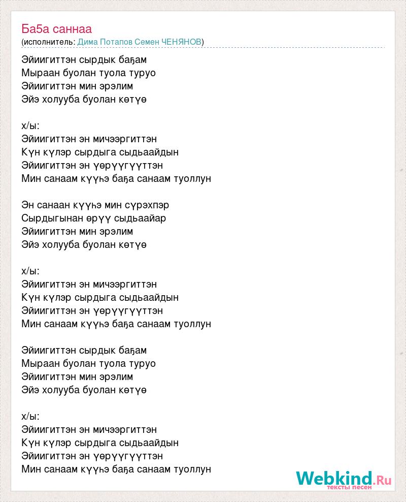 Эйиигиттэн сырдык баҕам Мыраан буолан туола туруо Эйиигиттэн мин эрэлим Эйэ холууба буолан көтүө х/ы: Эйиигиттэн эн мичээргиттэн Күн күлэр сырдыга сыдьаайдын Эйиигиттэн эн үөрүүгүүттэн Мин санаам күүһэ баҕа санаам туоллун Эн санаан күүһэ мин сүрэхпэр Сырдыгынан өрүү сыдьаайар Эйиигиттэн мин эрэлим Эйэ холууба буолан көтүө х/ы: Эйиигиттэн эн мичээргиттэн Күн күлэр сырдыга сыдьаайдын Эйиигиттэн эн үөрүүгүүттэн Мин санаам күүһэ баҕа санаам туоллун Эйиигиттэн сырдык баҕам Мыраан буолан туола туруо Эйиигиттэн мин эрэлим Эйэ холууба буолан көтүө х/ы: Эйиигиттэн эн мичээргиттэн Күн күлэр сырдыга сыдьаайдын Эйиигиттэн эн үөрүүгүүттэн Мин санаам күүһэ баҕа санаам туоллун