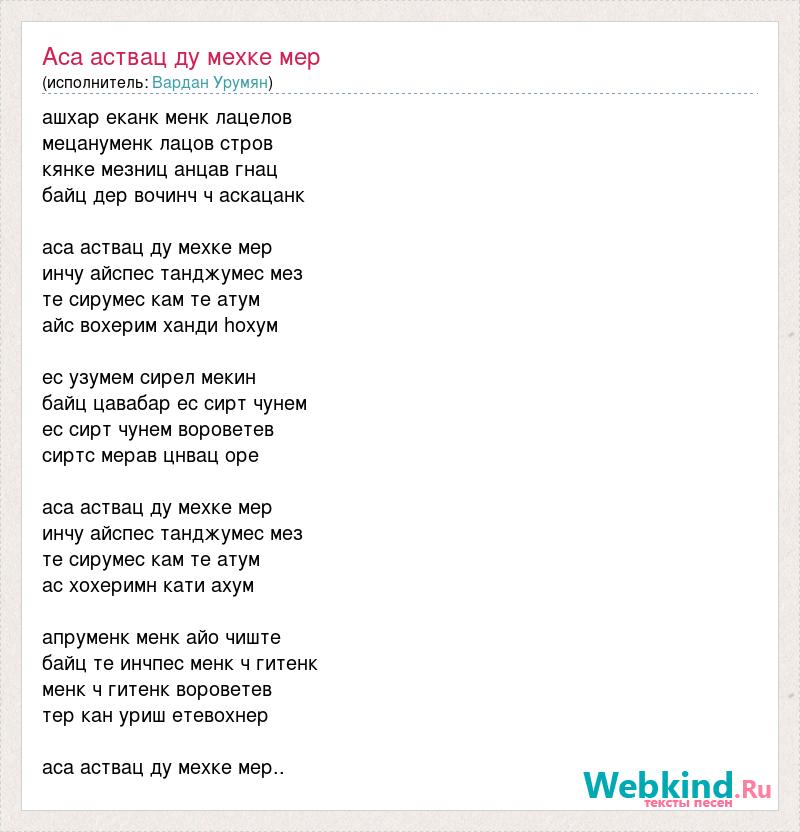 ашхар еканк менк лацелов мецануменк лацов стров кянке мезниц анцав гнац байц дер вочинч ч аскацанк аса аствац ду мехке мер инчу айспес танджумес мез те сирумес кам те атум айс вохерим ханди hохум ес узумем сирел мекин байц цавабар ес сирт чунем ес сирт чунем вороветев сиртс мерав цнвац оре аса аствац ду мехке мер инчу айспес танджумес мез те сирумес кам те атум ас хохеримн кати ахум апруменк менк айо чиште байц те инчпес менк ч гитенк менк ч гитенк вороветев тер кан уриш етевохнер аса аствац ду мехке мер..